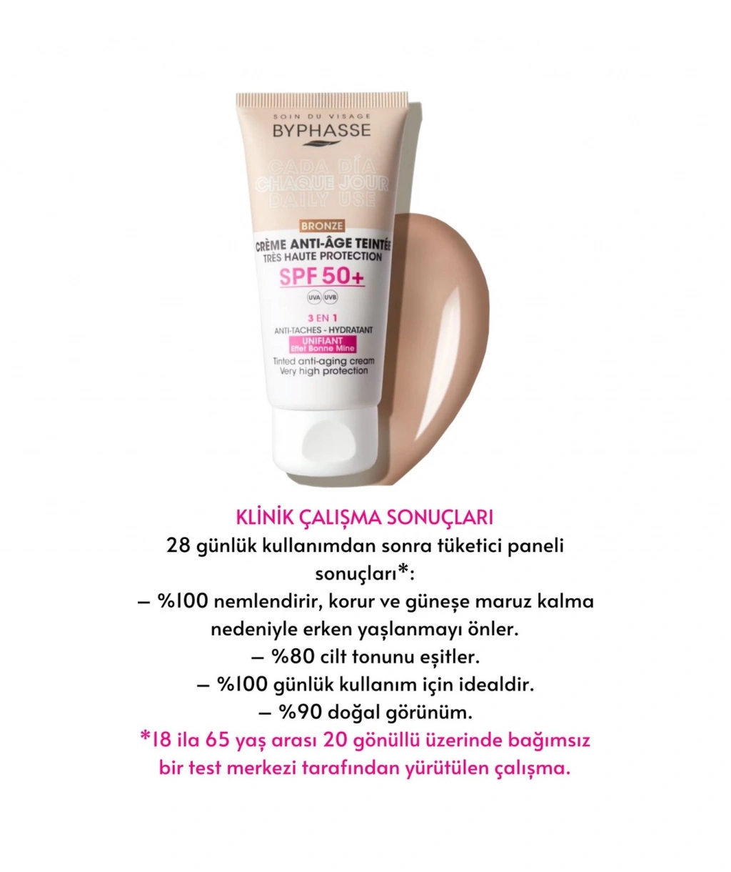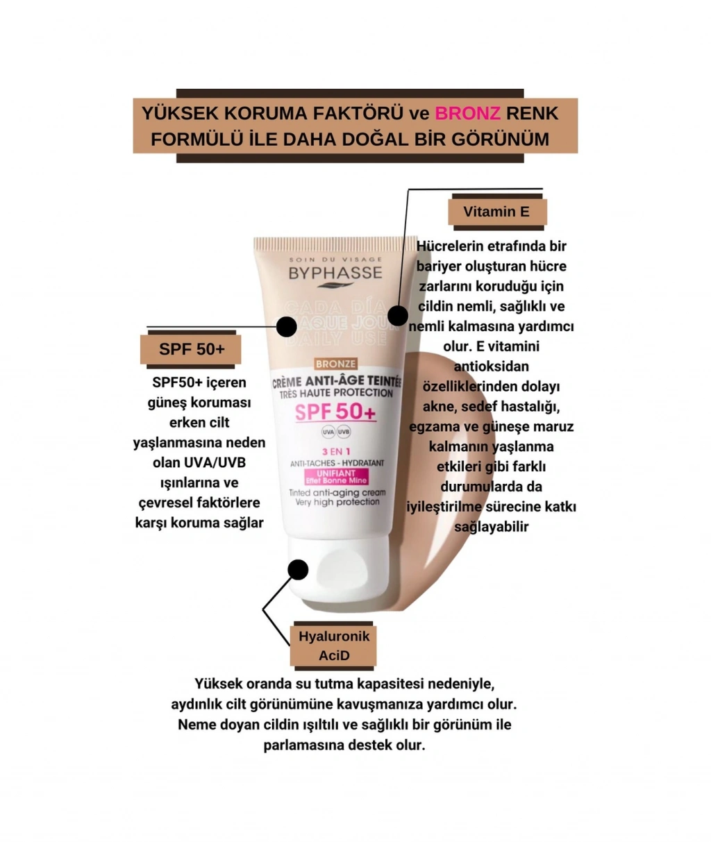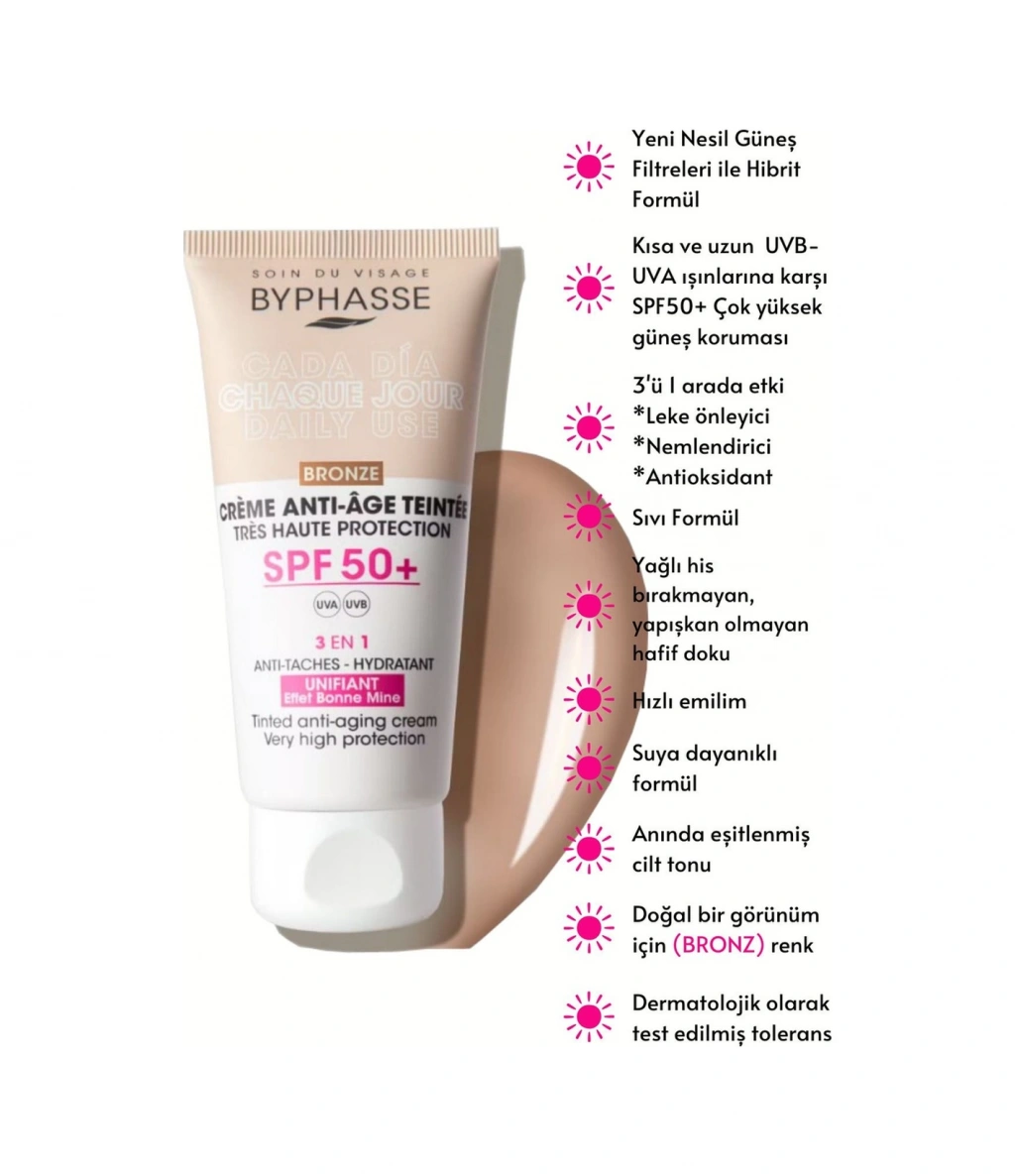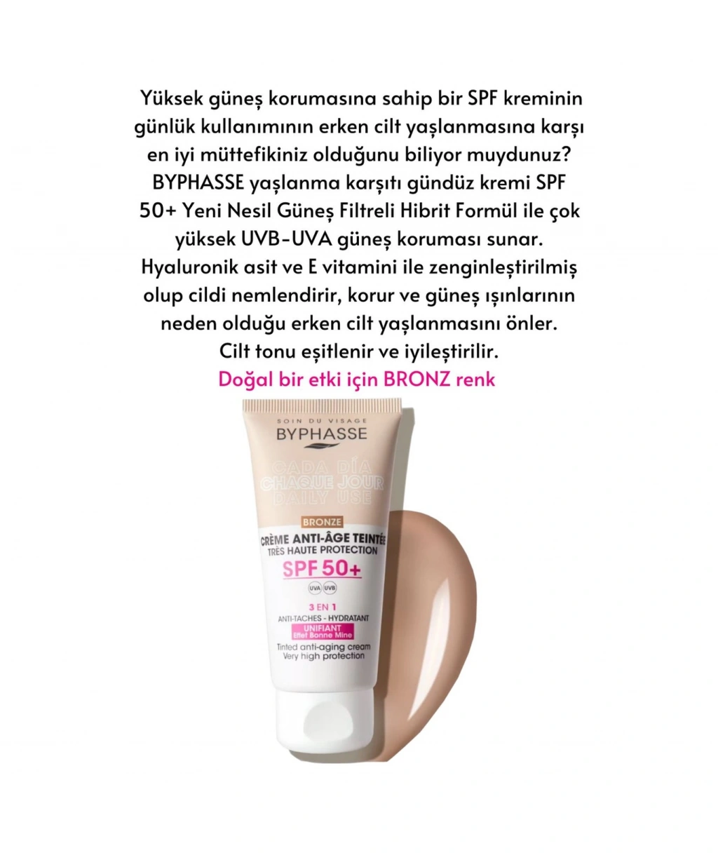 Byphasse Anti-Aging Renkli Sıvı Güneş Kremi BRONZRenk- Yeni Nesil Güneş Filtreli Hibrit Formül 50ml ; Cildinizi nemlendirirkenaynı zamanda yaşlanma karşıtı etki sağlar. ; Suya dayanıklı formülü ile yüzme ve terlemesırasında bile etkinliğini korur. ; Sıvıformu,cilde kolayca uygulanır ve hızlı emilim sağlar. ; Tüm cilt tipleri için uygun olan bu ürün,geniş bir kullanıcı yelpazesine hitap eder. ; SPF 50+ BRONZ Renk tonlu yaşlanmakarşıtı yüz kremi Yeni Nesil Güneş Filtreli Hibrit Formül ile çok yüksekUVB-UVA güneş koruması sunar ve güneşin zararlı ışınlarına karşı tam korumasağlar. ; Yaşlanma karşıtıözellikleriyle cildin genç görünümünü destekler. ; Doğal bir etki bırakan BRONZ renk tonile Cilt tonu eşitlenir ve iyileştirilir. ; 50 mlhacmiyle pratik kullanım sunar ve Pratik tüp ambalajı sayesinde seyahatlerdeyanınızda taşımanız için idealdir. ; Renkli görünümü (Bronz Ton) ile cilt tonunueşitleyerek doğal bir renk düzeltme etkisi yaratır. ; Şehirden plaja, güneştenkorunma HER GÜN gereklidir. Güneşi göremediğiniz bulutlu günlerde bile UVB/UVAışınları mevcuttur ve bazen güneşli bir günden bile daha güçlüdür. Bu nedenledermatologlar, mevsim ne olursa olsun günlük cilt bakım rutininize güneştenkorunmayı dahil etmenizi önerir. ; Hyaluronikasit ve E vitamini ilezenginleştirilmiş olup, güneşe maruz kalmanın neden olduğu erken ciltyaşlanmasını önler , cildi nemlendirir ve korur. ; KORUMA; SPF50+: koyu leke karşıtı etki ve güneş ışınlarının neden olduğu erken ciltyaşlanmasına karşı çok yüksek koruma. ; NEMLENDİRME ; HİYALÜRONİK ASİT: cildinemlendirir, elastikiyetini artırır, kırışıklıkları azaltmaya yardımcı olur vesıkılığını geri kazandırır. ; E VİTAMİNİ: formülün yaşlanma karşıtı etkisinigüçlendiren güçlü bir antioksidandır. ; DOĞAL GÖRÜNÜM ETKİSİ- EVRENSEL AÇIK /ORTA /BRONZ: doğal bir görünüm için cilt tonunu eşitler. ; KLİNİK ÇALIŞMA SONUÇLARI ; 28 günlükkullanımdan sonra tüketici paneli sonuçları*: ; %100 nemlendirir, korurve güneşe maruz kalmanedeniyle erken yaşlanmayı önler. ; %80 cilt tonunu eşitler.; %100 günlük kullanımiçin idealdir. ; %90 doğal görünüm. ; *18 ila 65yaş arası 20 gönüllü üzerindebağımsız bir test merkezi tarafından yürütülen çalışma. ; NasılKullanılır? : Kullanmadan önce çalkalayınız. Güneşe çıkmadan önce yeterlimiktarda ürünü tüm yüzünüze ve boynunuza eşit miktarda dağıtarak uygulayın.Güneşten korumanın devamlılığını sağlamak için ürünün 2-3 saatte biryenilenmesi uygundur.