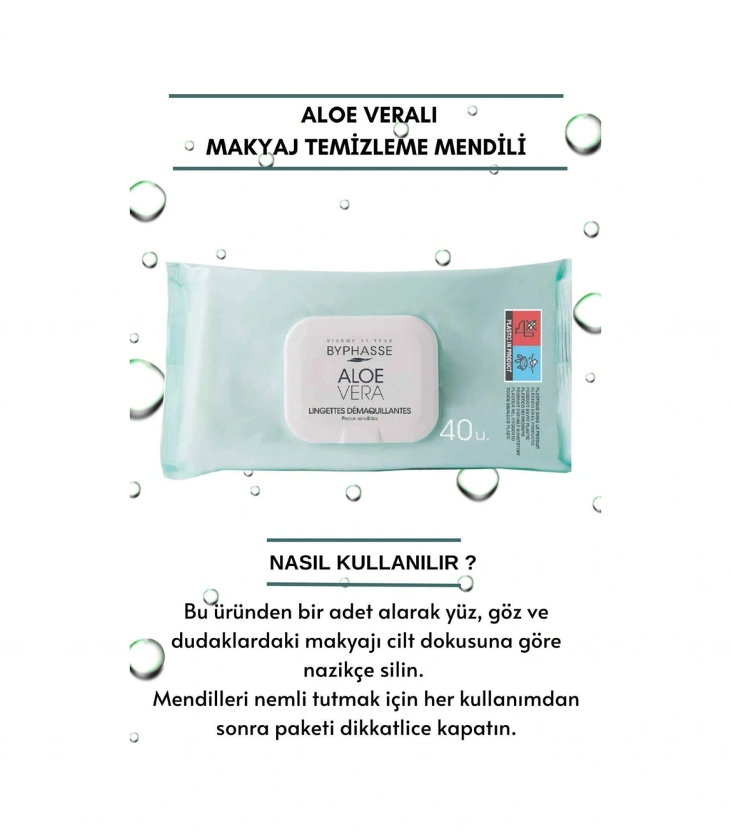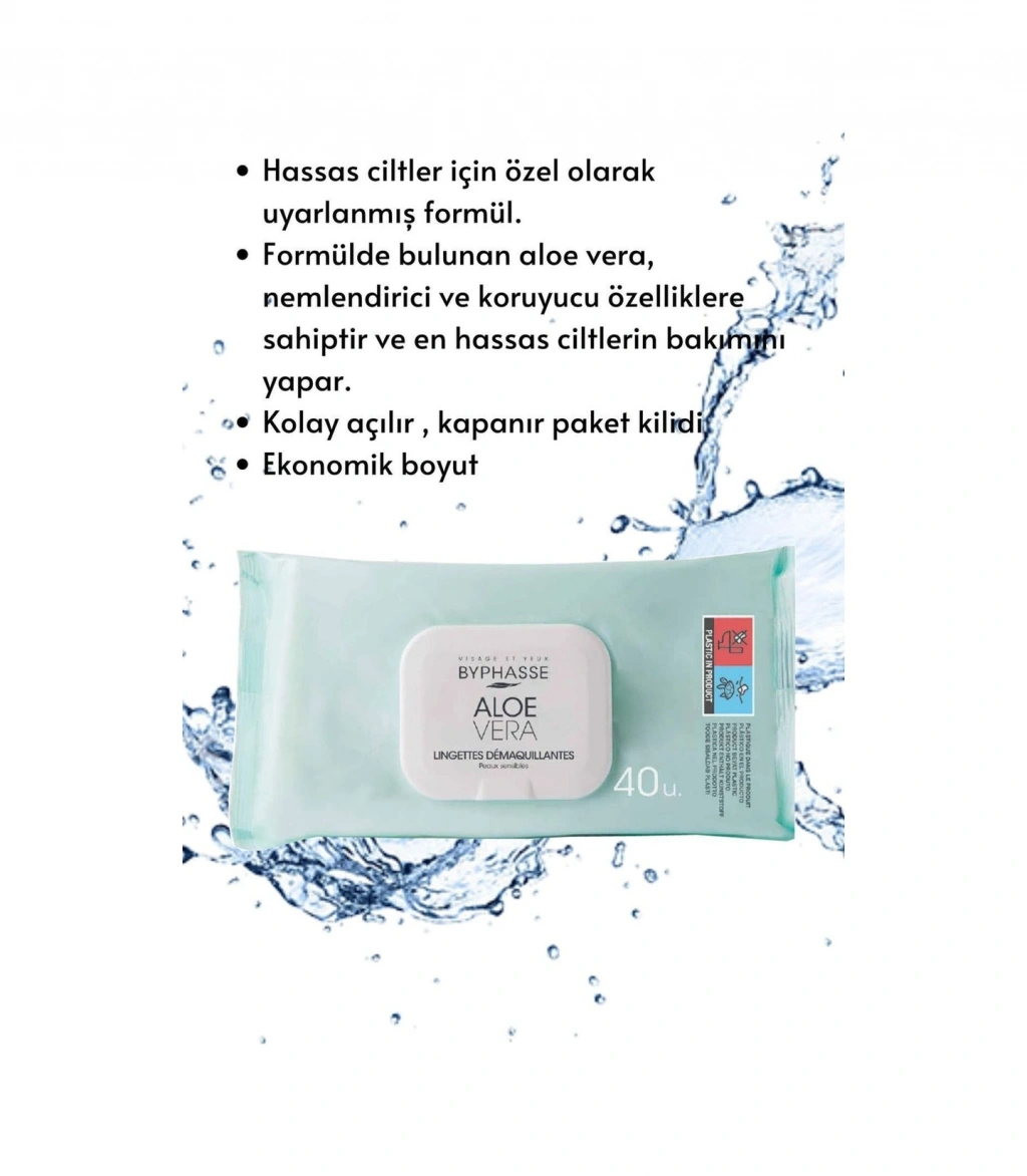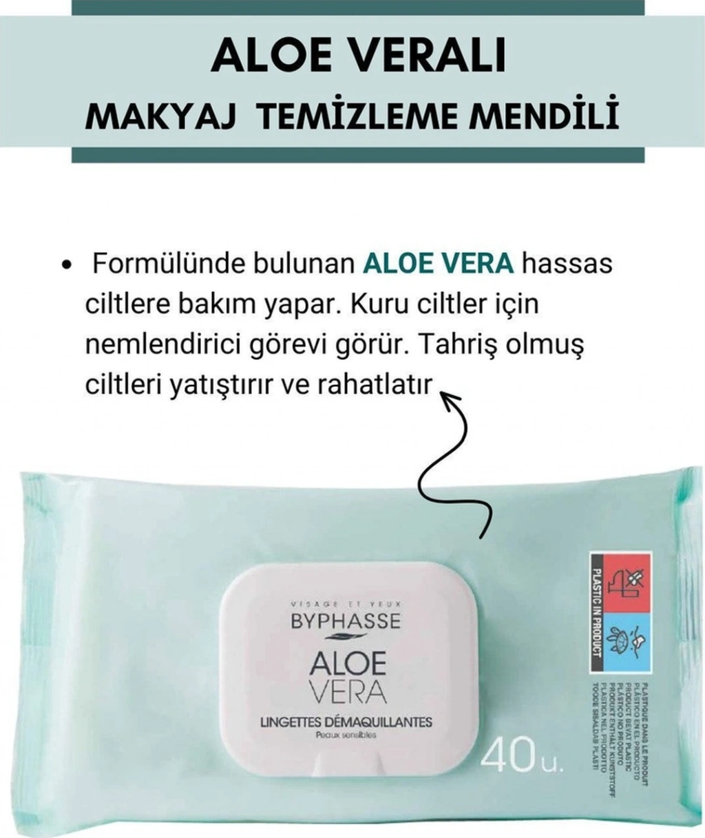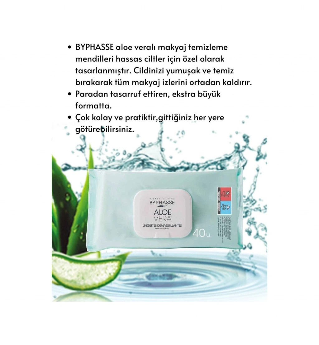 BYPHASSE aloe veralı makyaj temizleme mendilleri hassas ciltler için özel olarak tasarlanmıştır. Cildinizi yumuşak ve temiz bırakarak tüm makyaj izlerini ortadan kaldırır ;Paradan tasarruf ettiren, ekstra büyük formatta. ;Çok kolay ve pratiktir,gittiğiniz her yere götürebilirsiniz. ;Hassas ciltler için özel olarak uyarlanmış formül. ;Formülde bulunan aloe vera, nemlendirici ve koruyucu özelliklere sahiptir ve en hassas ciltlerin bakımını yapar. ;ALOE VERA: Tahriş olmuş hassas ciltlere bakım yaparken yatıştırır ve rahatlatır. Kuru ciltler için nemlendirici görevi görür. ;Kolay açılır , kapanır paket kilidi ;Ekonomik boyut ;Nasıl Kullanılır :Bu üründen bir adet alarak yüz, göz ve dudaklardaki makyajı cilt dokusuna göre nazikçe silin. Mendilleri nemli tutmak için her kullanımdan sonra paketi dikkatlice kapatın.