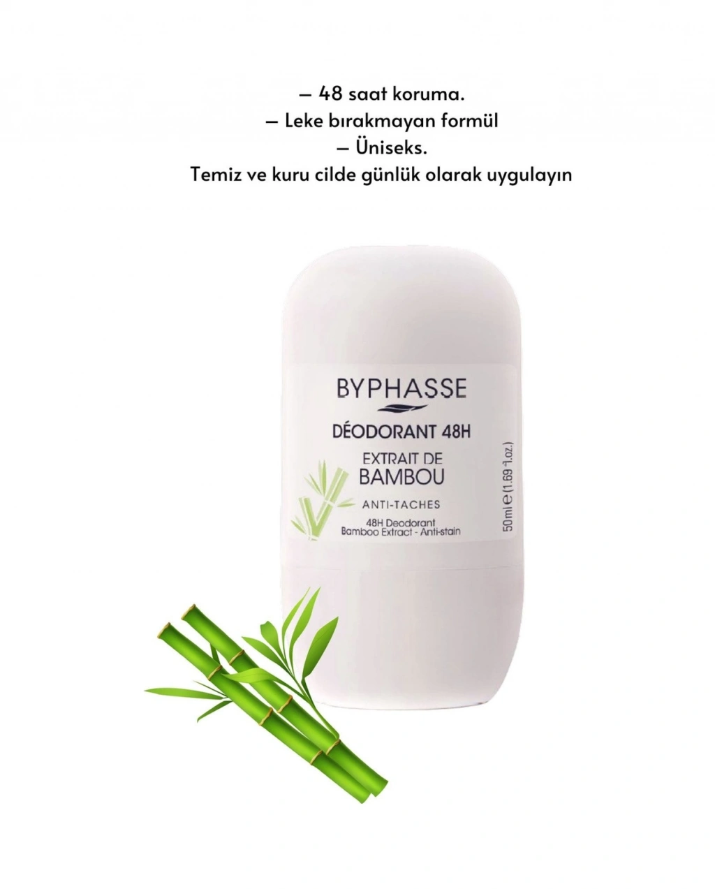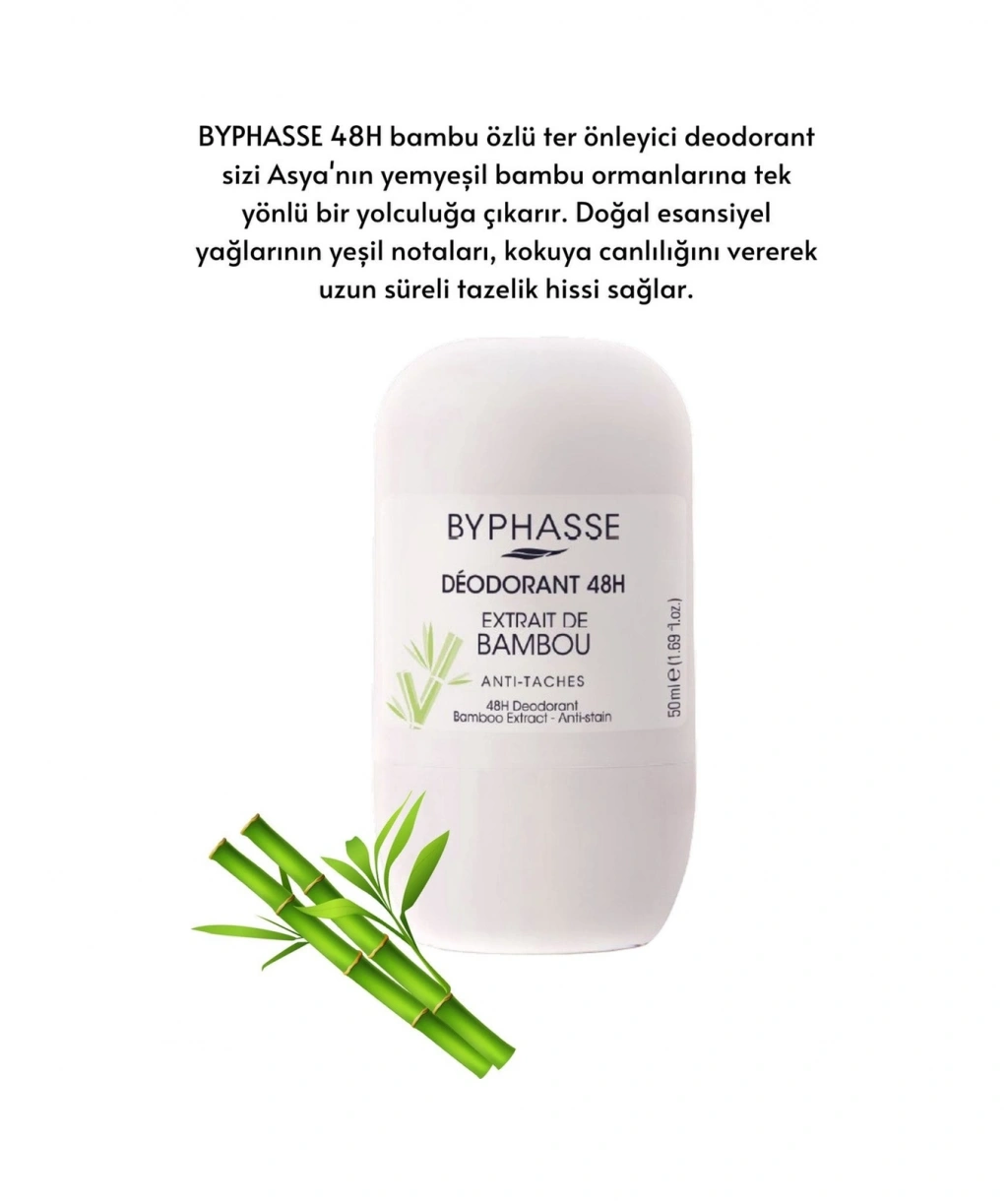 BYPHASSE 48H bambu özlü ter önleyici deodorant sizi Asya'nın yemyeşil bambu ormanlarına tek yönlü bir yolculuğa çıkarır. ;Doğal esansiyel yağlarının yeşil notaları, kokuya canlılığını vererek uzun süreli tazelik hissi sağlar.; 48 saat koruma. ;Leke bırakmayan formül ; Üniseks. ;Temiz ve kuru cilde günlük olarak uygulayın