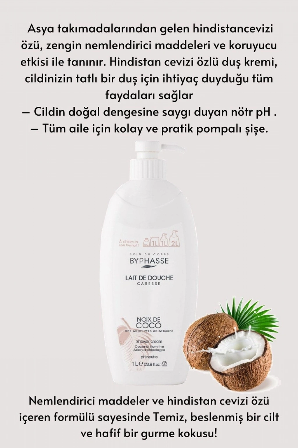 Asya takımadalarından gelen hindistancevizi özü, zengin nemlendirici maddeleri ve koruyucu etkisi ile tanınır. ;Hindistan cevizi özlü duş kremi, cildinizin tatlı bir duş için ihtiyaç duyduğu tüm faydaları sağlar ; Cildin doğal dengesine saygı duyan nötr pH . ; Tüm aile için kolay ve pratik pompalı şişe.; Nemlendirici maddeler ve hindistan cevizi özü içeren formülü sayesinde Temiz, beslenmiş bir cilt ve hafif bir gurme kokusu!; Vegan formül. ;Nasıl Kullanılır :Günlük cilt bakımınızın bir parçası olarak duşta kullanın.Islak cildinize bir veya iki ceviz büyüklüğünde damlatın. Yumuşak bir köpüğe dönüşene kadar hafifçe masaj yapın ve ardından durulayın