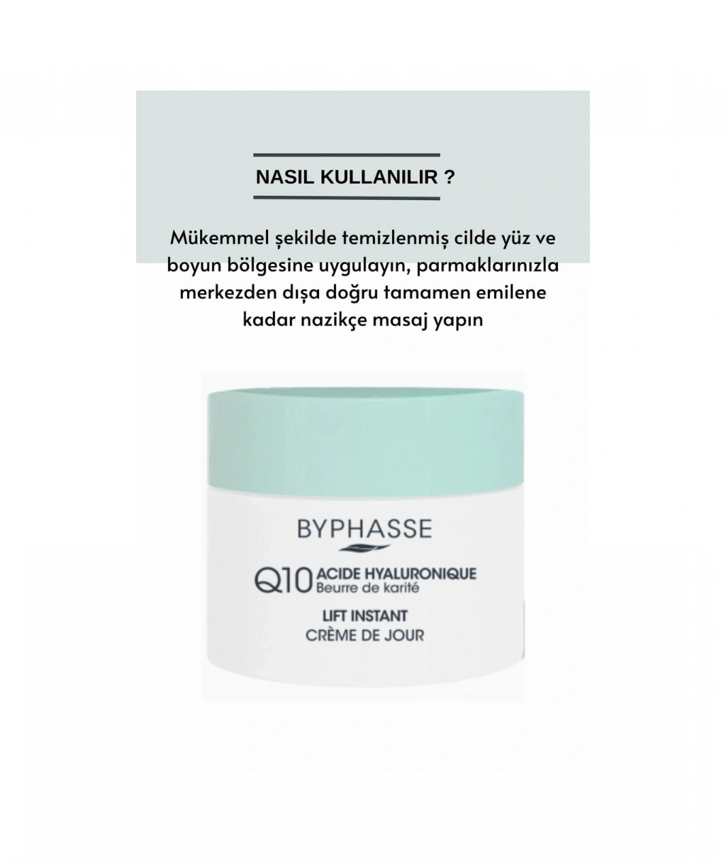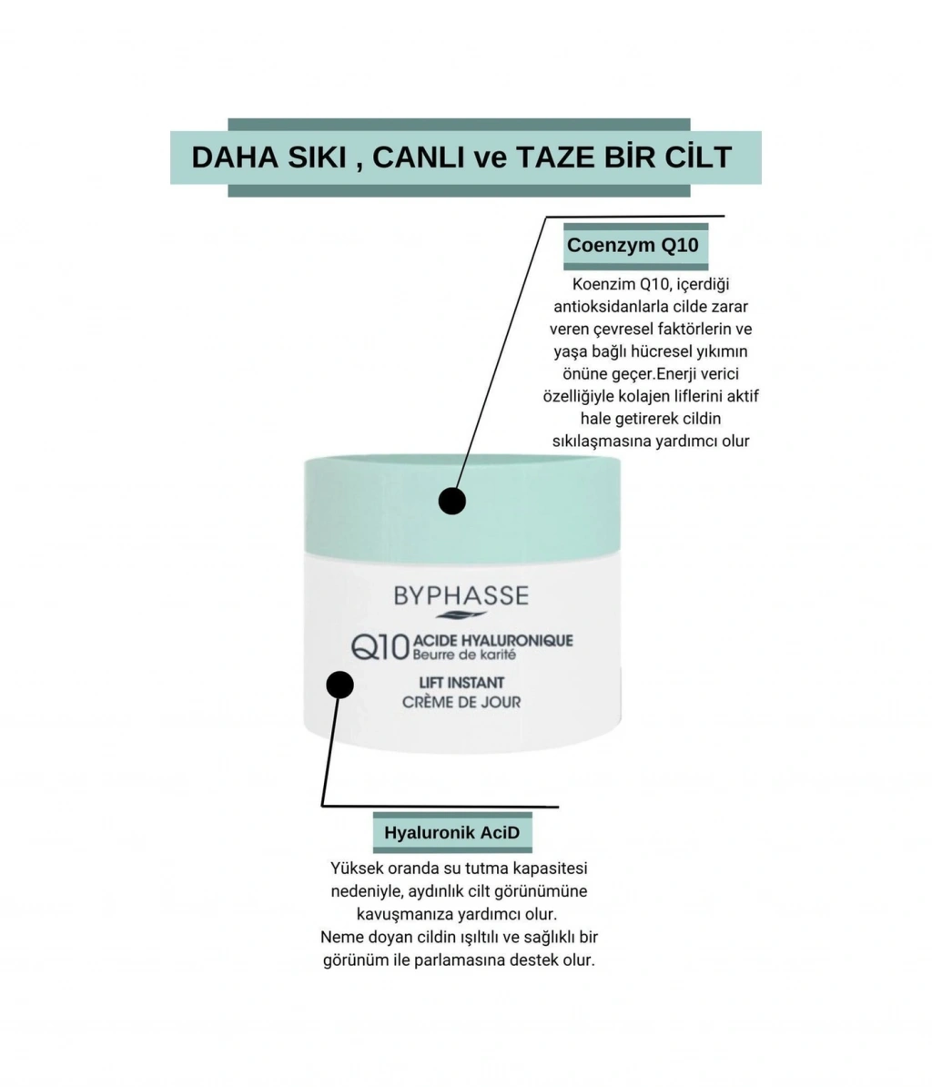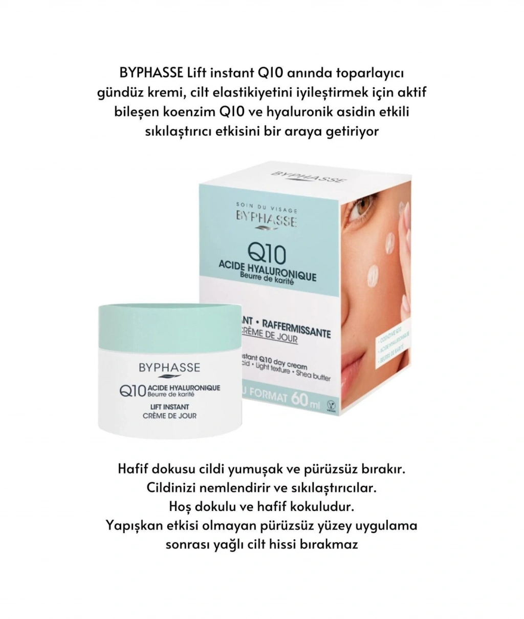 Koenzim Q10 ve Hyaluronik Asit (kırışıklıkları önleyici bileşen) vücutta doğal olarak bulunur ve zamanla azalır.; BYPHASSE Lift instant Q10 anında toparlayıcı gündüz kremi, cilt elastikiyetini iyileştirmek için aktif bileşen koenzim Q10 ve hyaluronik asidin etkili sıkılaştırıcı etkisini bir araya getiriyor ;Hafif dokusu cildi yumuşak ve pürüzsüz bırakır. ;Cildinizi nemlendirir ve sıkılaştırıcılar. ;Hoş dokulu ve hafif kokuludur. ;Yapışkan etkisi olmayan pürüzsüz yüzey uygulama sonrası yağlı cilt hissi bırakmaz.; Nasıl Kullanılır Mükemmel şekilde temizlenmiş cilde yüz ve boyun bölgesine uygulayın, parmaklarınızla merkezden dışa doğru tamamen emilene kadar nazikçe masaj yapın