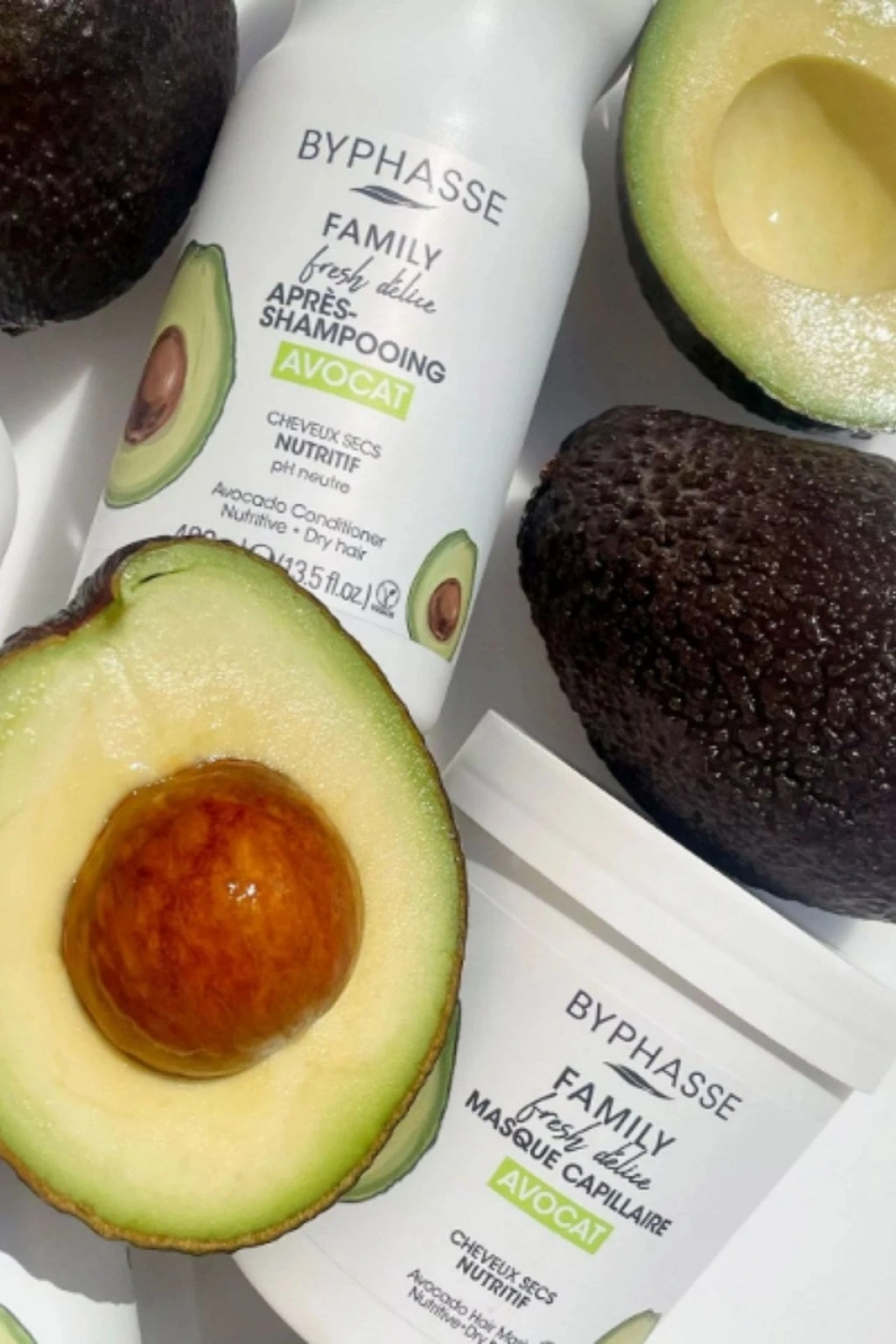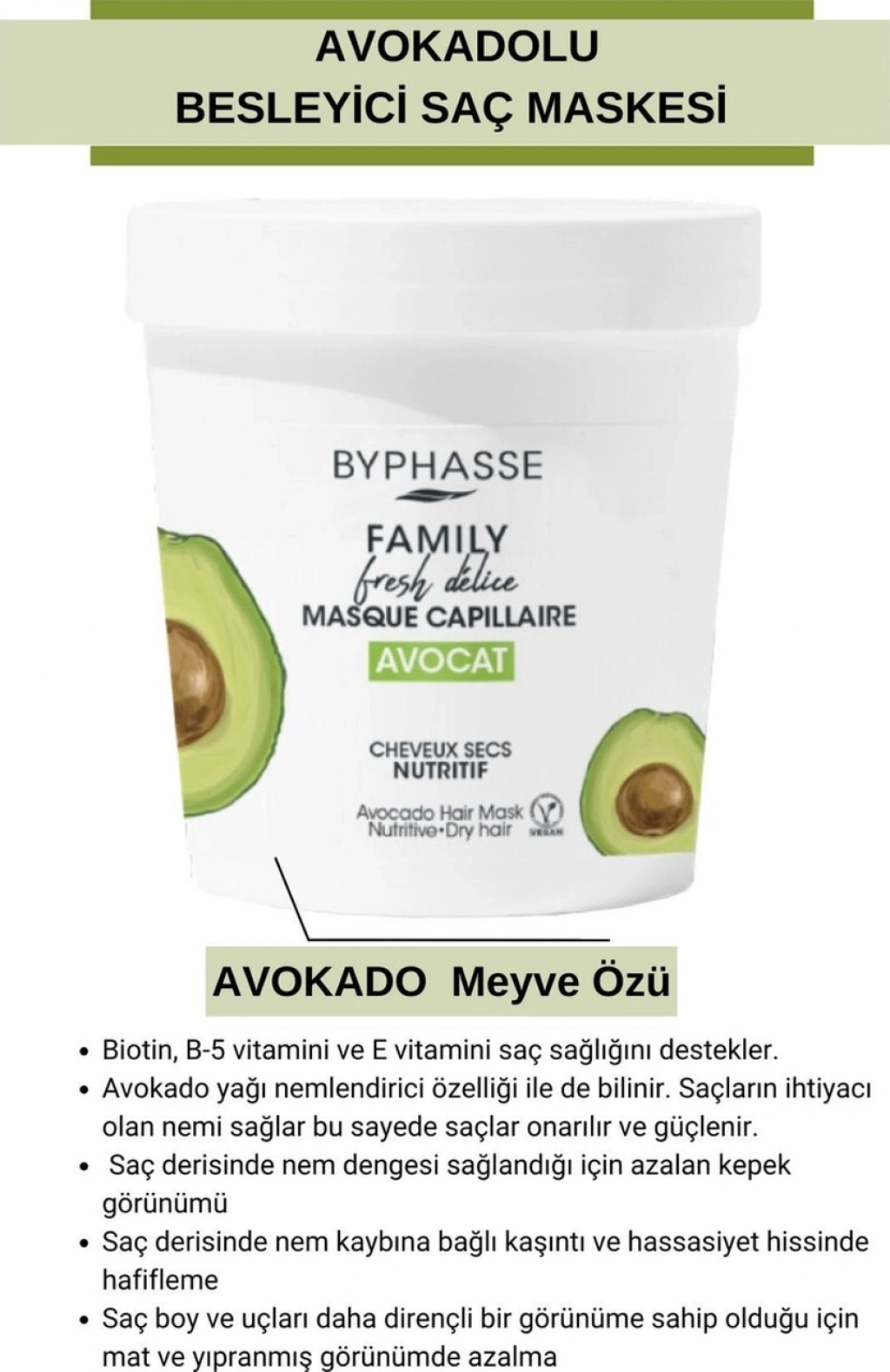 Kuru saçlar için Byphasse Family Fresh Délice avokadolu maskesi, saçı yoğun bir şekilde besler, yumuşak ve ipeksi bırakır. ;Nemlendirici ve antioksidan özelliklere sahip avokado özü içeren formül. ;Avokado yağı :nemlendirici özelliği ile de bilinir. Saçların ihtiyacı olan nemi sağlar bu sayede saçlar onarılır ve güçlenir.; Biotin, B-5 vitamini ve E vitamini saç sağlığını destekler. ; Saç derisinde nem dengesi sağlandığı için azalan kepek görünümü. ;Saç derisinde nem kaybına bağlı kaşıntı ve hassasiyet hissinde hafifleme. ;Saç boy ve uçları daha dirençli bir görünüme sahip olduğu için mat ve yıpranmış görünümde azalma. ;Vegan formül .;Nasıl Kullanılır :Nemli saça uygulayın, 5 dakika bekletin ve durulayın