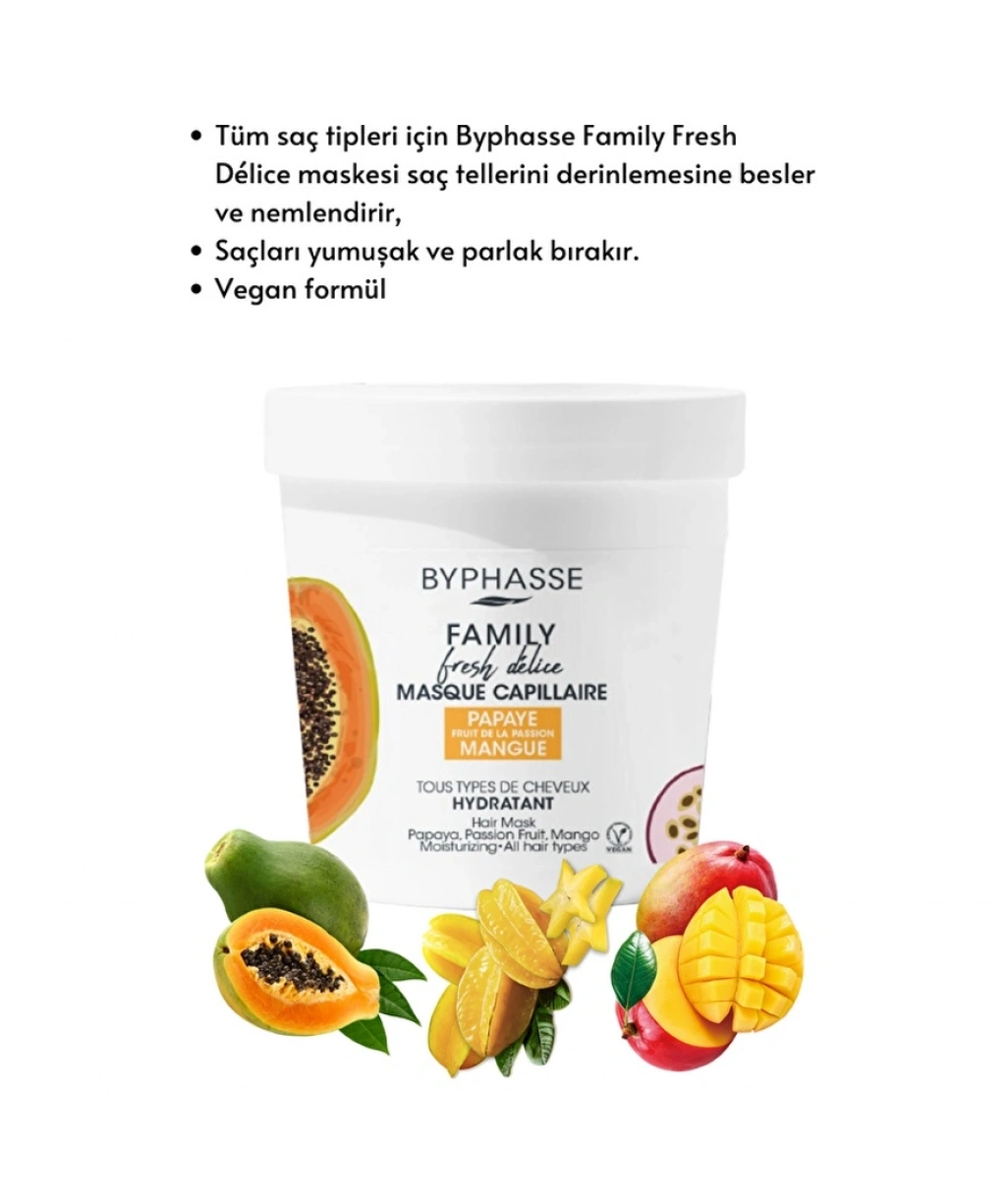 Tüm saç tipleri için Byphasse Family Fresh Délice maskesi saç tellerini derinlemesine besler ve nemlendirir. ;Saçları yumuşak ve parlak bırakır. ;Canlandırıcı özelliklere sahip papaya özü, çarkıfelek meyvesi ve mango suyu içeren formül. ;Yıldız meyvesinin içerisinde bulunan C ve B vitaminleri sayesinde saç telleri ve saç köklerinizin sağlığı daha iyi hale gelecektir. Daha uzun ve daha sağlıklı sağlara sahip olmanızı destekler. ; Mango Meyve Ozu Düzenli kullanımda kırık saçları onarır daha parlak ve canlı bir görünüm verir. Hem kırıkların onarılmasına, hem de yıpranmış saçların güçlenmesine yardımcı olur. ;Papaya saçları canlandırır, yumuşatır ve nemlendirir. A vitamini içeriği sayesinde sebum üretimini arttırır, saç tellerini derinlemesine nemlendirmeye yardımcı olabilecek bir grup enzim içerir, ;Papayada folik asit bulunur ve bu da saç foliküllerine giden kan dolaşımını iyileştirir ve saç uzamasını hızlandırır.;Nasıl Kullanılır :Nemli saça uygulayın, 5 dakika bekletin ve durulayın.;Vegan formül
