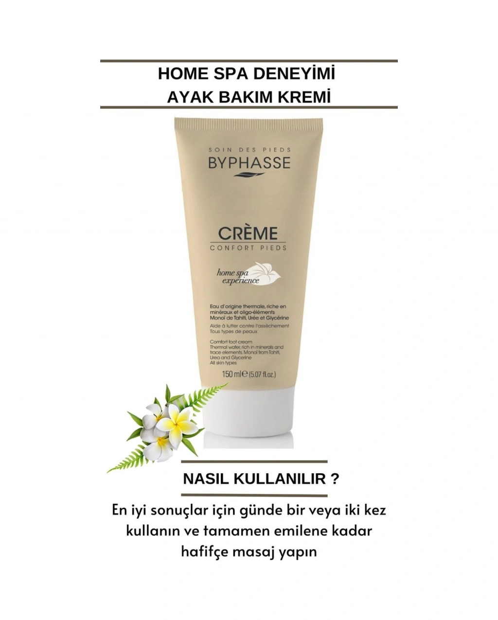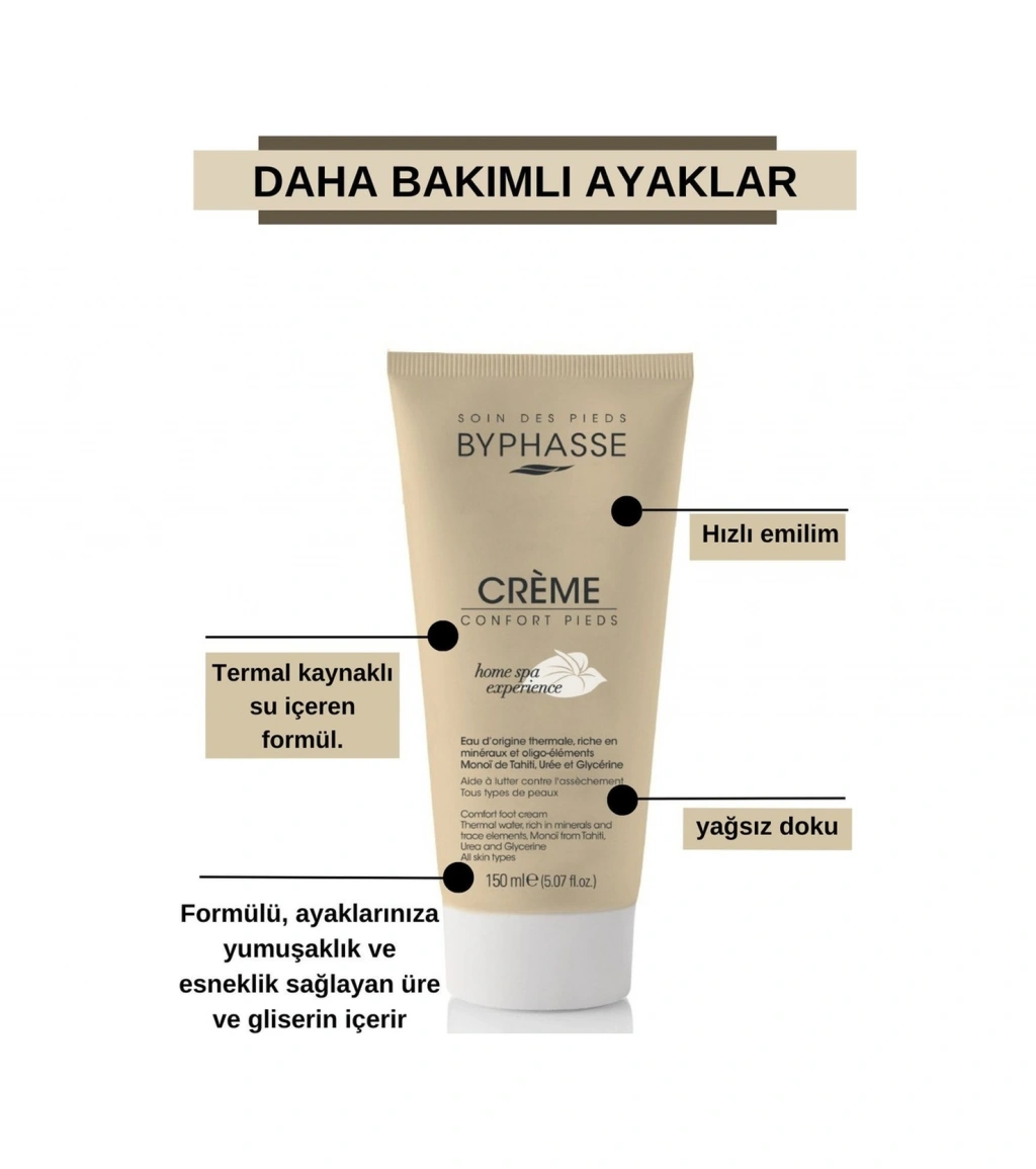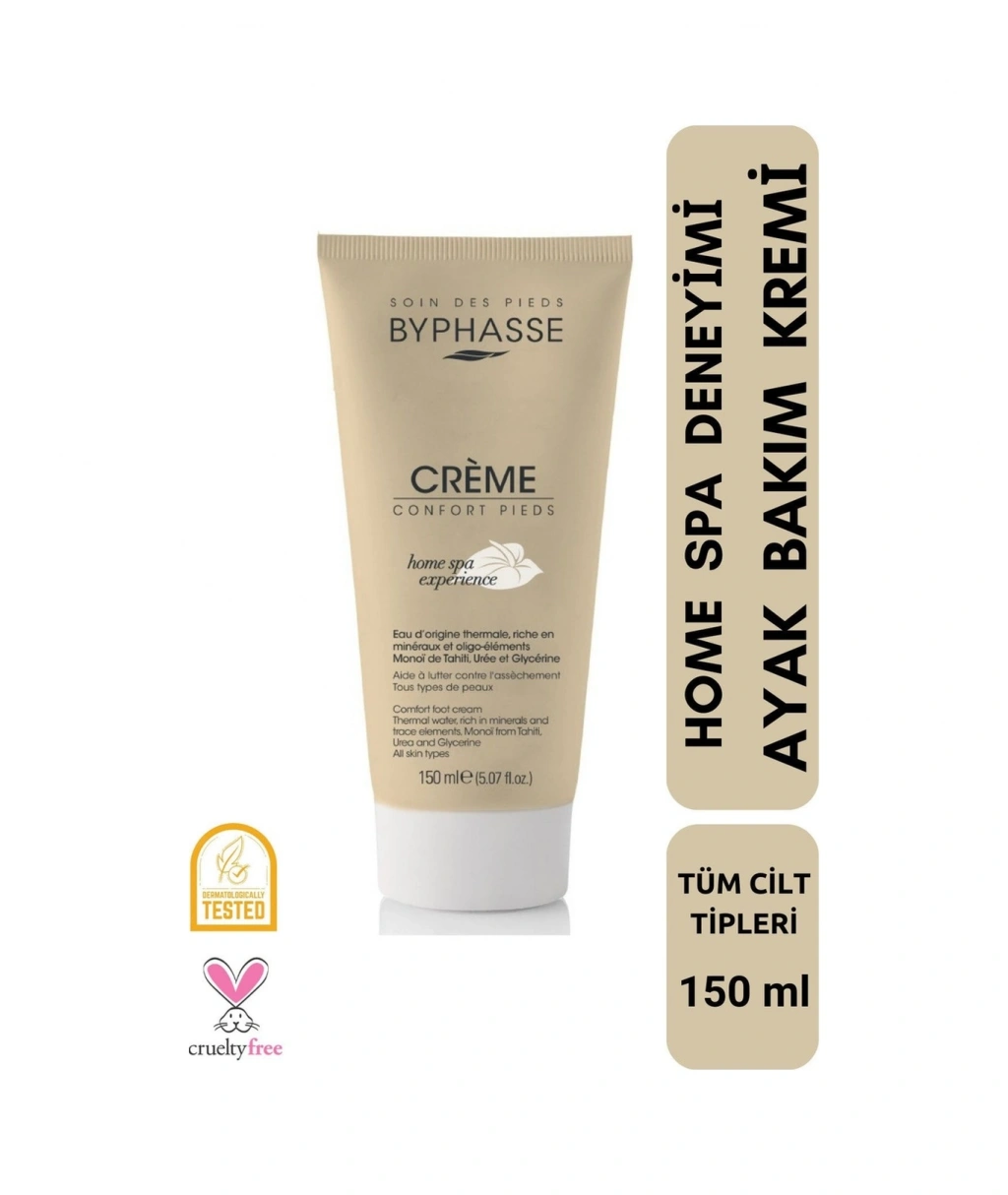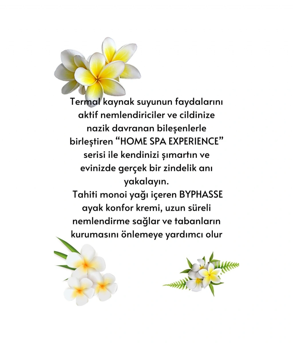 Termal kaynak suyunun faydalarını aktif nemlendiriciler ve cildinize nazik davranan bileşenlerle birleştiren “HOME SPA EXPERIENCE” serisi ile kendinizi şımartın ve evinizde gerçek bir zindelik anı yakalayın. ;Tahiti monoi yağı içeren BYPHASSE ayak konfor kremi, uzun süreli nemlendirme sağlar ve tabanların kurumasını önlemeye yardımcı olur.; Nasıl Kullanılı En iyi sonuçlar için günde bir veya iki kez kullanın ve tamamen emilene kadar hafifçe masaj yapın