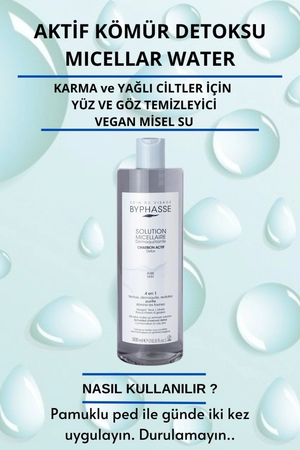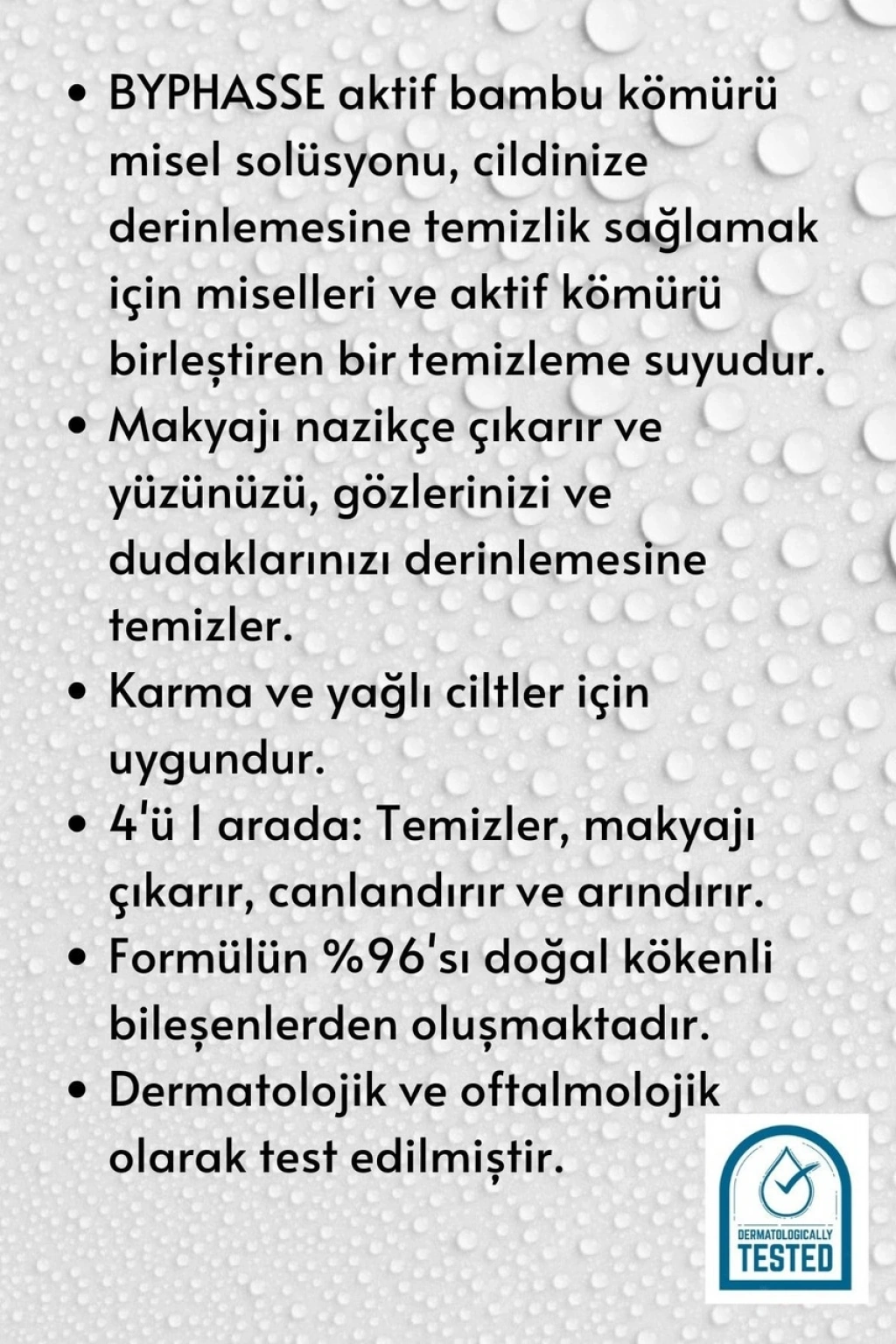 BYPHASSE aktif bambu kömürü misel solüsyonu, cildinize derinlemesine temizlik sağlamak için miselleri ve aktif kömürü birleştiren bir temizleme suyudur.; Makyajı nazikçe çıkarır ve yüzünüzü, gözlerinizi ve dudaklarınızı derinlemesine temizler. Karma ve yağlı ciltler için uygundur.; 4'ü 1 arada: Temizler, makyajı çıkarır, canlandırır ve arındırır.; Formülün %96'sı doğal kökenli bileşenlerden oluşmaktadır.; Dermatolojik ve oftalmolojik olarak test edilmiştir;Pamuklu ped ile günde iki kez uygulayın. Durulamayın..