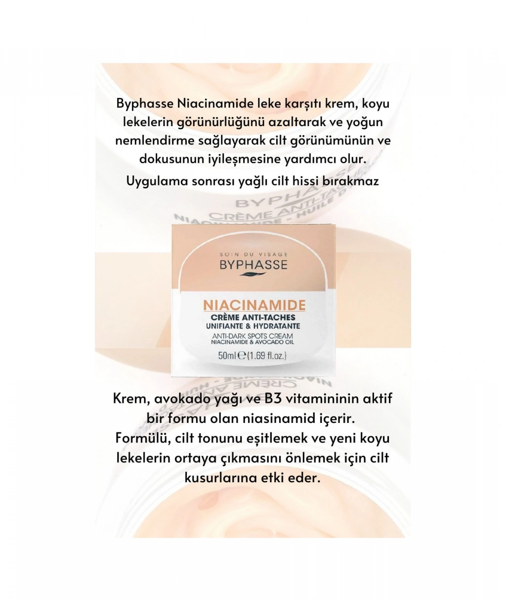 Byphasse Niacinamide leke karşıtı krem, koyu lekelerin görünürlüğünü azaltarak ve yoğun nemlendirme sağlayarak cilt görünümünün ve dokusunun iyileşmesine yardımcı olur. ;Uygulama sonrası yağlı cilt hissi bırakmaz.; Krem, avokado yağı ve B3 vitamininin aktif bir formu olan niasinamid içerir. ;Formülü, cilt tonunu eşitlemek ve yeni koyu lekelerin ortaya çıkmasını önlemek için cilt kusurlarına etki eder.; Nasıl Kullanılır: Sabah ve akşam temiz cilde yüz ve boyun bölgesine uygulayın, parmaklarınızla merkezden dışa doğru, göz çevresinden kaçınarak tamamen emilene kadar nazikçe masaj yapın