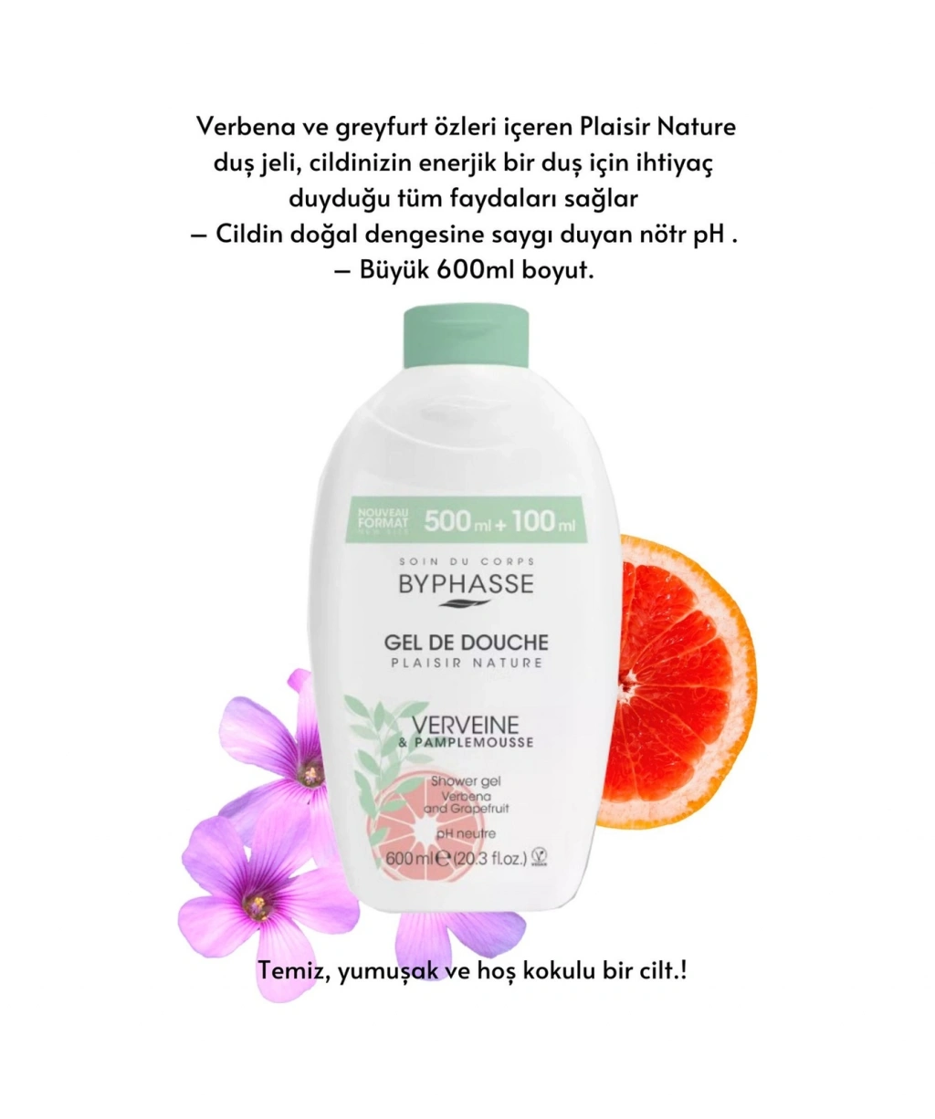 Plaisir Natura Verbena & Greyfurt Duş Jeli 600ml ; Verbena ve greyfurt özleri içeren Plaisir Nature duş jeli, cildinizin enerjik bir duş için ihtiyaç duyduğu tüm faydaları sağlar. ;Cildin doğal dengesine saygı duyan nötr pH . ; Temiz, yumuşak ve hoş kokulu bir cilt!; Vegan formül. ;Nasıl Kullanılır :Günlük cilt bakımınızın bir parçası olarak duşta kullanın.Islak cildinize bir veya iki ceviz büyüklüğünde damlatın. Yumuşak bir köpüğe dönüşene kadar hafifçe masaj yapın ve ardından durulayın