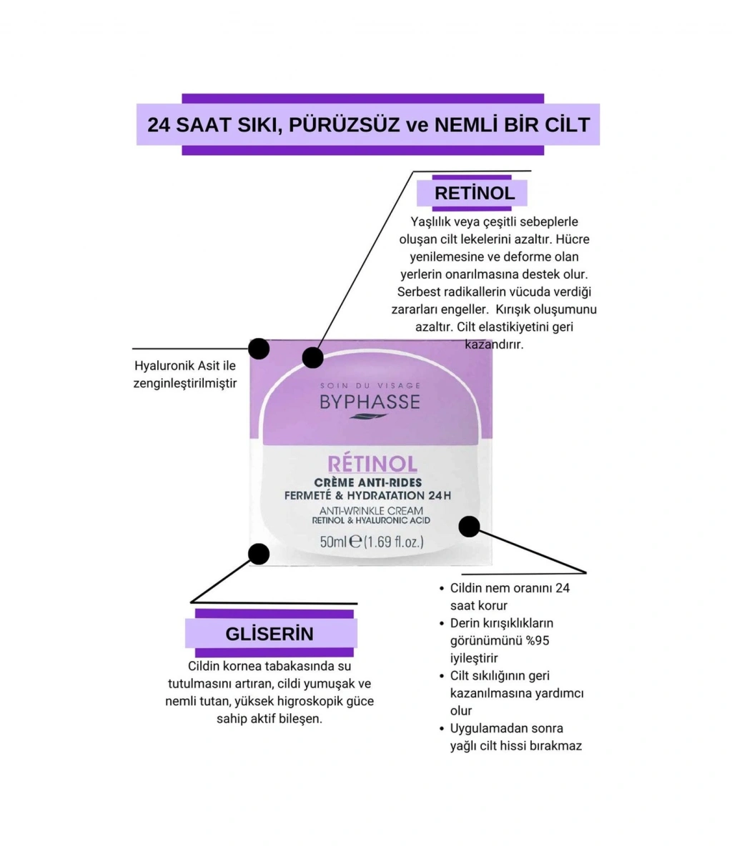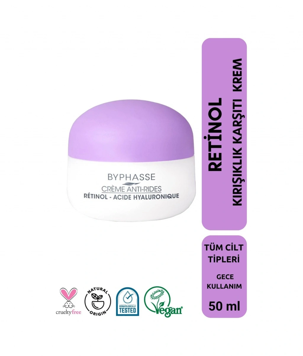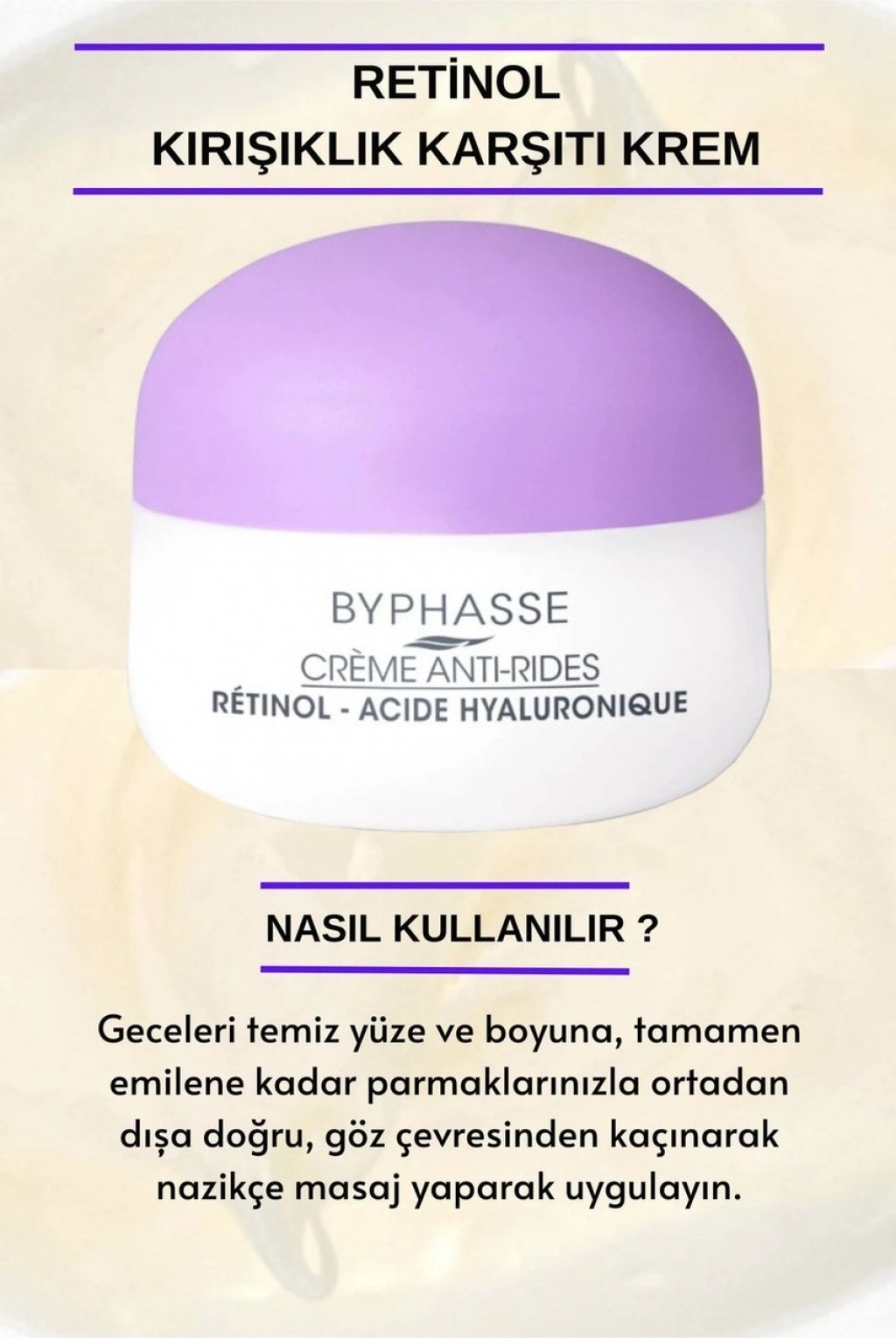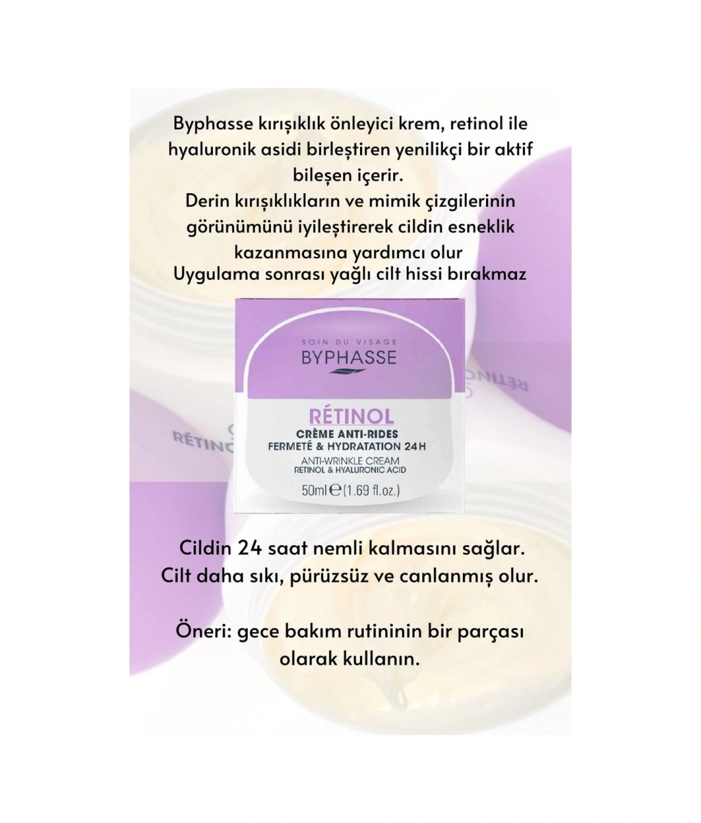 Byphasse Retinol kırışıklık önleyici krem, retinol ile hyaluronik asidi birleştiren yenilikçi bir aktif bileşen içerir. ;Derin kırışıklıkların ve mimik çizgilerinin görünümünü iyileştirerek cildin esneklik kazanmasına yardımcı olur.; Uygulama sonrası yağlı cilt hissi bırakmaz Cildin 24 saat nemli kalmasını sağlar. ;Cilt daha sıkı, pürüzsüz ve canlanmış olur. ;Öneri: gece bakım rutininin bir parçası olarak kullanın. ;Nasıl Kullanılır Geceleri temiz yüze ve boyuna, tamamen emilene kadar parmaklarınızla ortadan dışa doğru, göz çevresinden kaçınarak nazikçe masaj yaparak uygulayın.