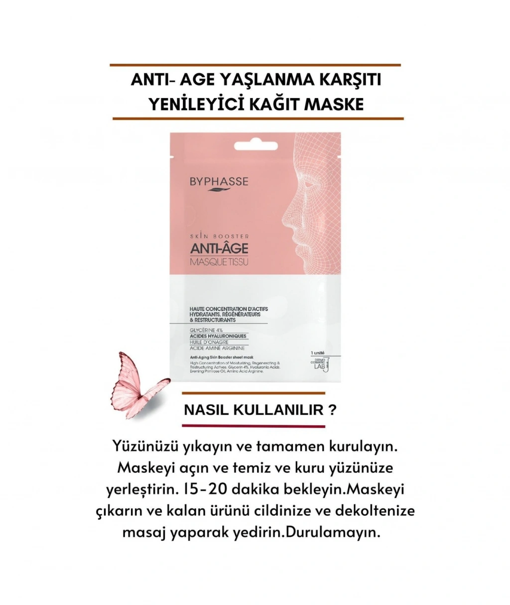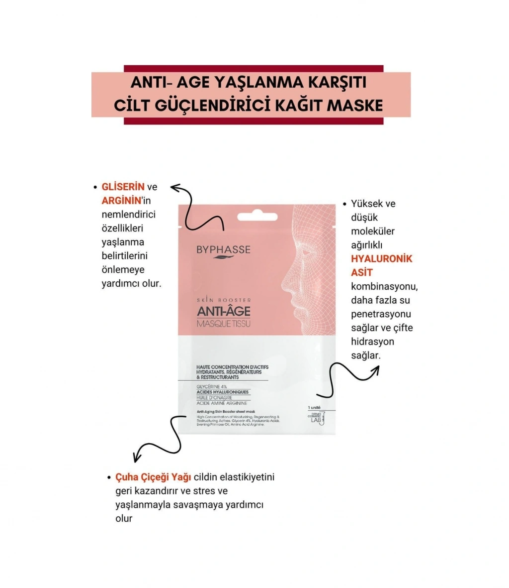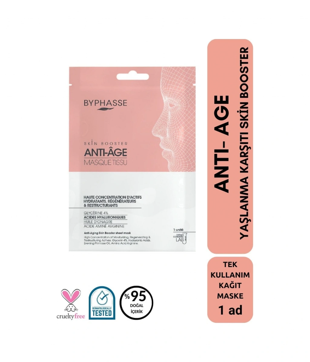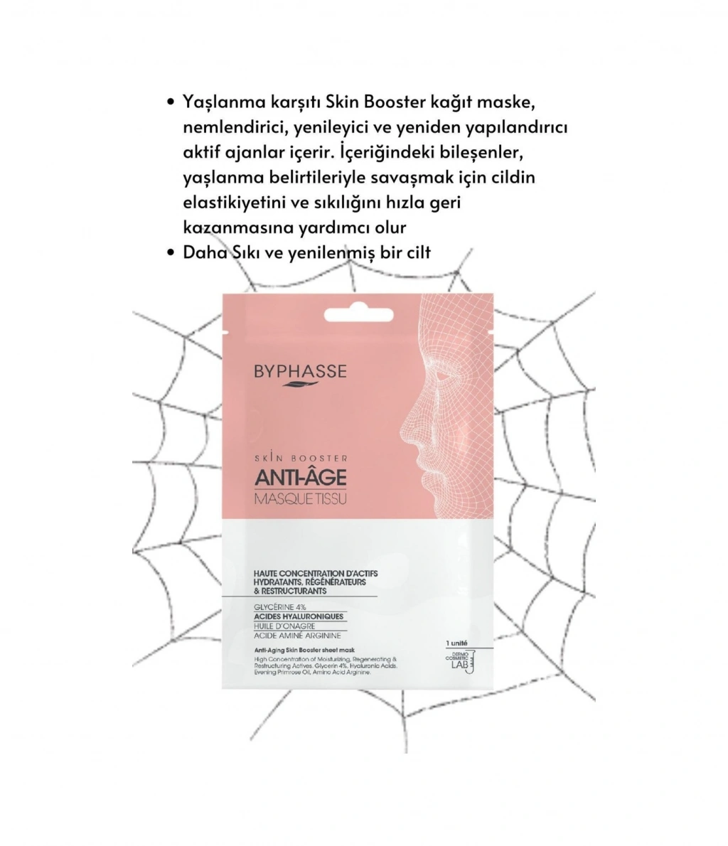BYPHASSE Skin Booster tabaka maskeleri, belirli cilt ihtiyaçları için gerekli aktif bileşenleri içerir. Dermo-kozmetik laboratuvarında geliştirilen formülü, yüksek oranda doğal kaynaklı içeriğe sahiptir. ;Kullanımı kolaydır, tek kullanımlıktır ve yüz şekline mükemmel uyum sağlar.;Yaşlanma karşıtı Skin Booster kağıt maske, nemlendirici, yenileyici ve yeniden yapılandırıcı aktif ajanlar içerir.; İçeriğindeki bileşenler, yaşlanma belirtileriyle savaşmak için cildin elastikiyetini ve sıkılığını hızla geri kazanmasına yardımcı olur.; GLİSERİN ve ARGİNİN'in nemlendirici özellikleri yaşlanma belirtilerini önlemeye yardımcı olur .;Yüksek ve düşük moleküler ağırlıklı HYALURONİK ASİT kombinasyonu, daha fazla su penetrasyonu sağlar ve çifte hidrasyon sağlar. ;Çuha Çiçeği Yağı cildin elastikiyetini geri kazandırır ve stres ve yaşlanmayla savaşmaya yardımcı olur. ;Daha Sıkı ve yenilenmiş bir cilt .;Cilt yorgun olduğunda, özel bir gün öncesinde canlandırıcı etki için sihirli bir dokunuş. ;%95 doğal kökenli bileşenler. ;Dermo-kozmetik laboratuvarında geliştirilmiş formüller. ;Pratik ve hafif format ;%100 viskon kumaş ; Nasıl Kullanılır:Yüzünüzü yıkayın ve tamamen kurulayın. Maskeyi açın ve temiz ve kuru yüzünüze yerleştirin. 15-20 dakika bekleyin.Maskeyi çıkarın ve kalan ürünü cildinize ve dekoltenize masaj yaparak yedirin.Durulamayın.