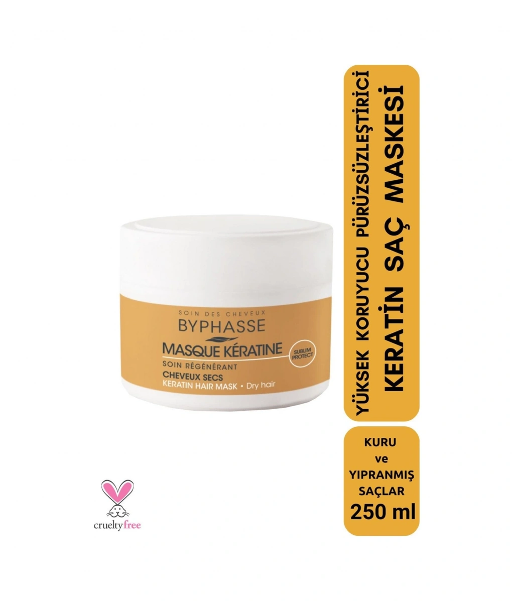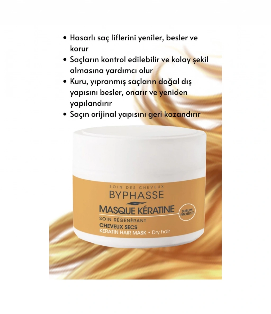 Byphasse Sublim Protect Keratin Saç Maskesi ile daha yumuşak, parlak ve kökten uca beslenmiş saçlar.; Kuru saçları besler ve derinlemesine onarır ve pürüzsüzleştirir, elektriklenme belirtilerini azaltır.;Hasarlı saç liflerini yeniler, besler ve korur. ;Saçların kontrol edilebilir ve kolay şekil almasına yardımcı olur. ;Kuru, yıpranmış saçların doğal dış yapısını besler, onarır ve yeniden yapılandırır. ;Saçın orijinal yapısını geri kazandırır. ; Nasıl Kullanılır: Nemli saça uygulayın. Etki etmesi için 5 dakika bekletin, sonra durulayın. Uygulama sonrası saç kolay yönetilebilir ve daha yumuşak hale gelir, saçlarınız parlayacak ve ipeksi bir pürüzsüzlüğe kavuşacaktır.