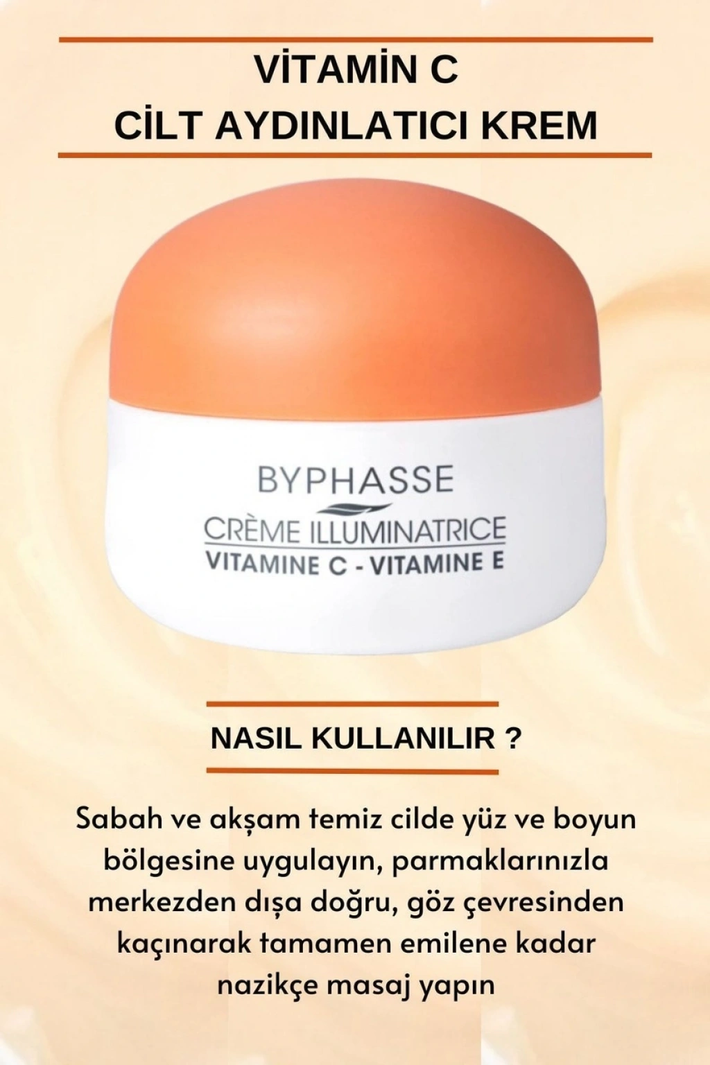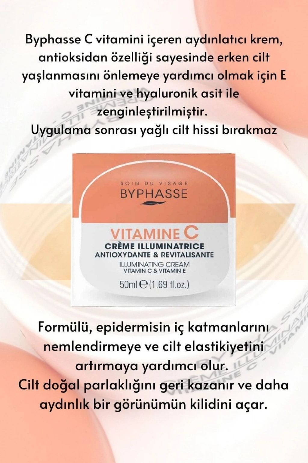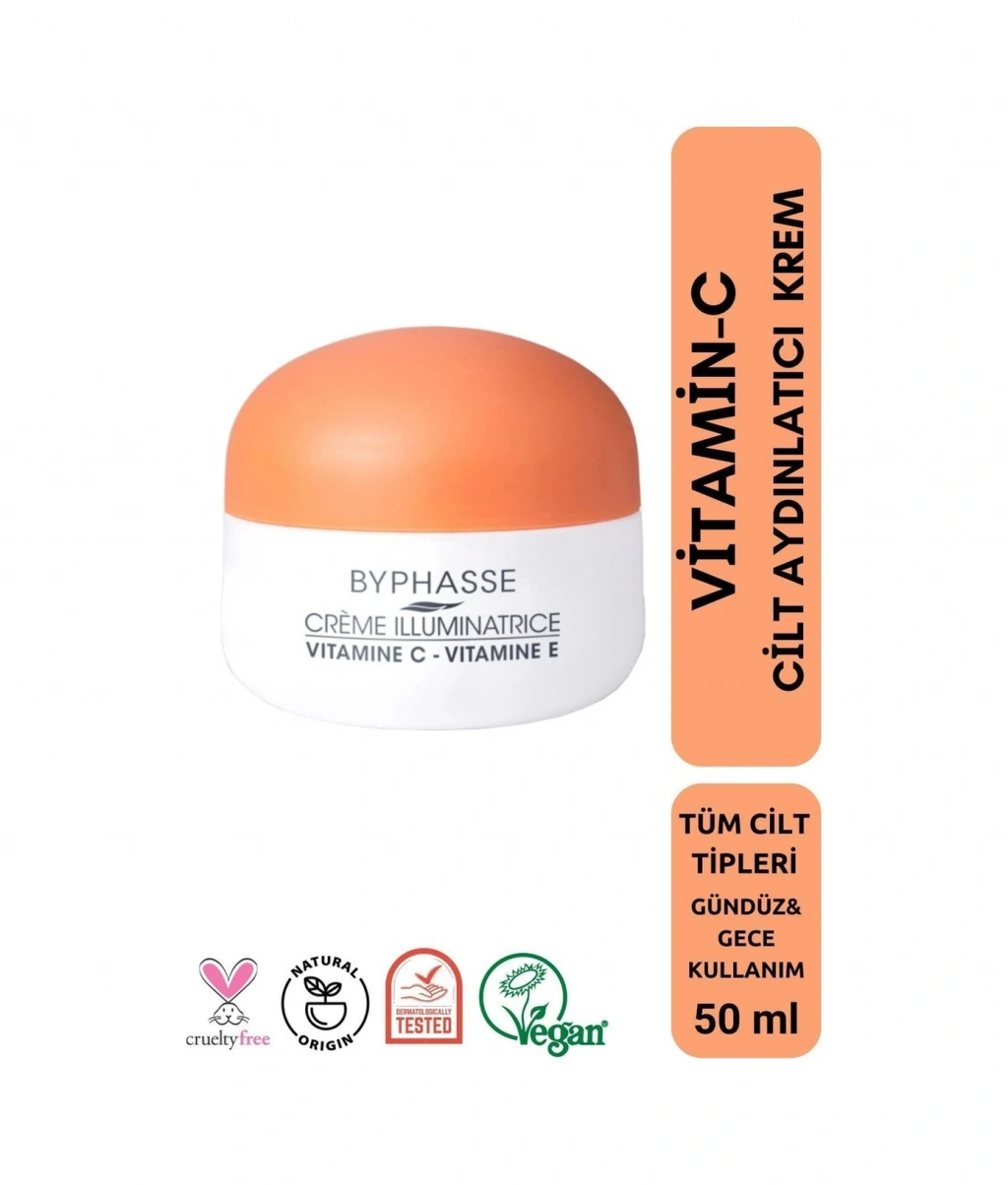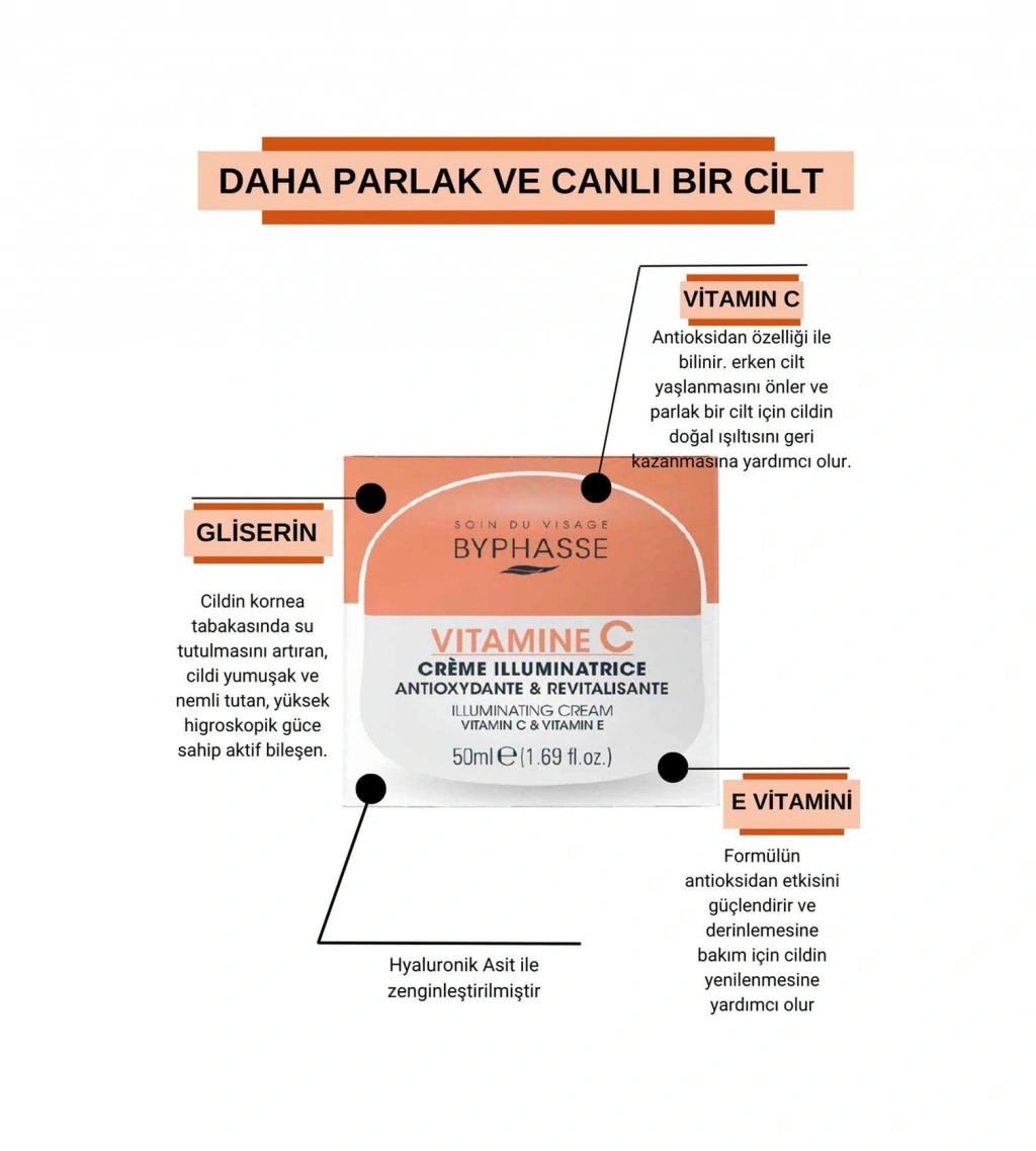 Byphasse C vitamini içeren aydınlatıcı krem, antioksidan özelliği sayesinde erken cilt yaşlanmasını önlemeye yardımcı olmak için E vitamini ve hyaluronik asit ile zenginleştirilmiştir. ;Uygulama sonrası yağlı cilt hissi bırakmaz Formülü, epidermisin iç katmanlarını nemlendirmeye ve cilt elastikiyetini artırmaya yardımcı olur. ;Cilt doğal parlaklığını geri kazanır ve daha aydınlık bir görünümün kilidini açar. ;Nasıl Kullanılır: Sabah ve akşam temiz cilde yüz ve boyun bölgesine uygulayın, parmaklarınızla merkezden dışa doğru, göz çevresinden kaçınarak tamamen emilene kadar nazikçe masaj yapın