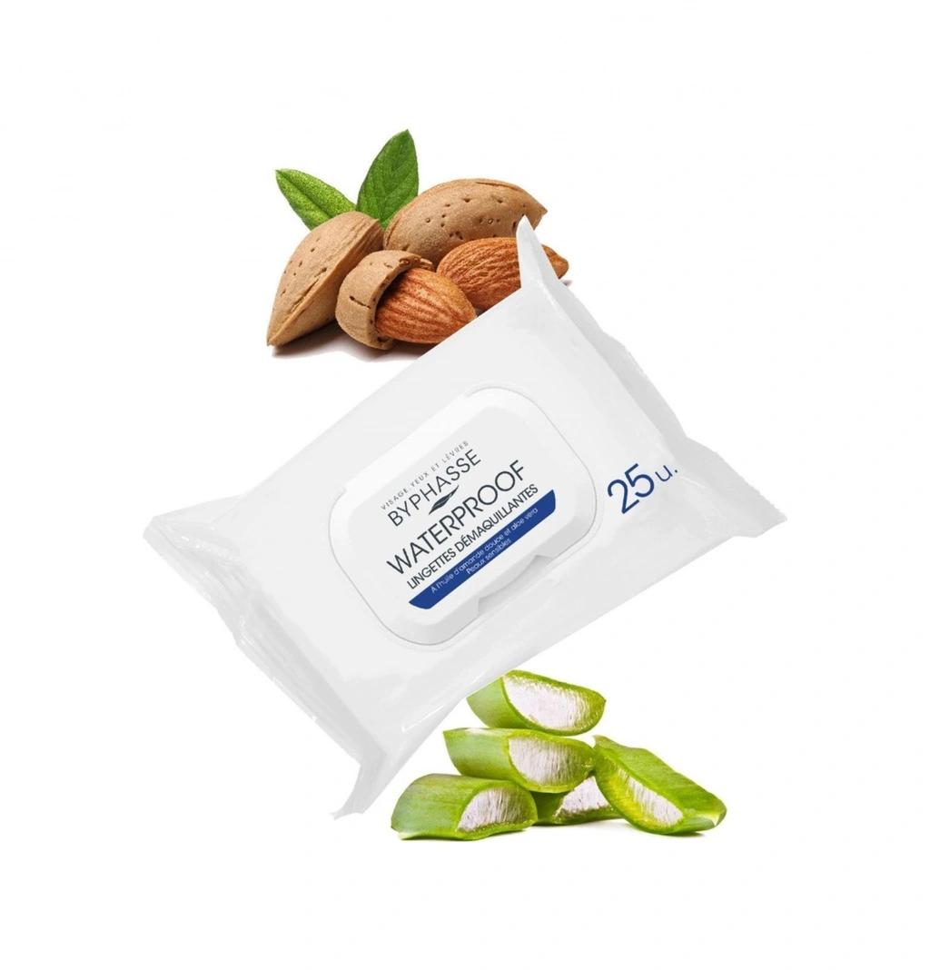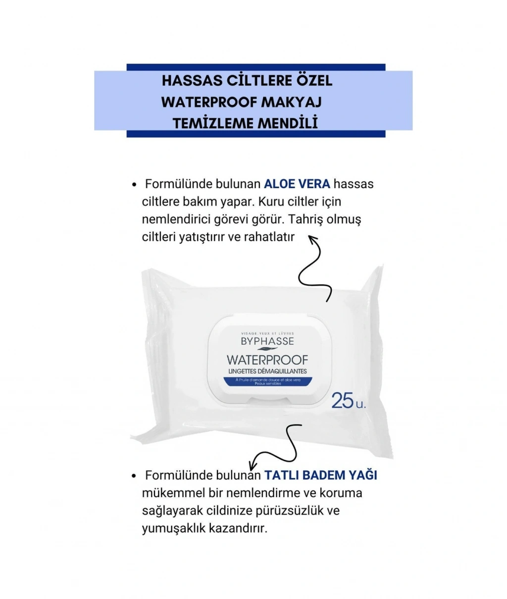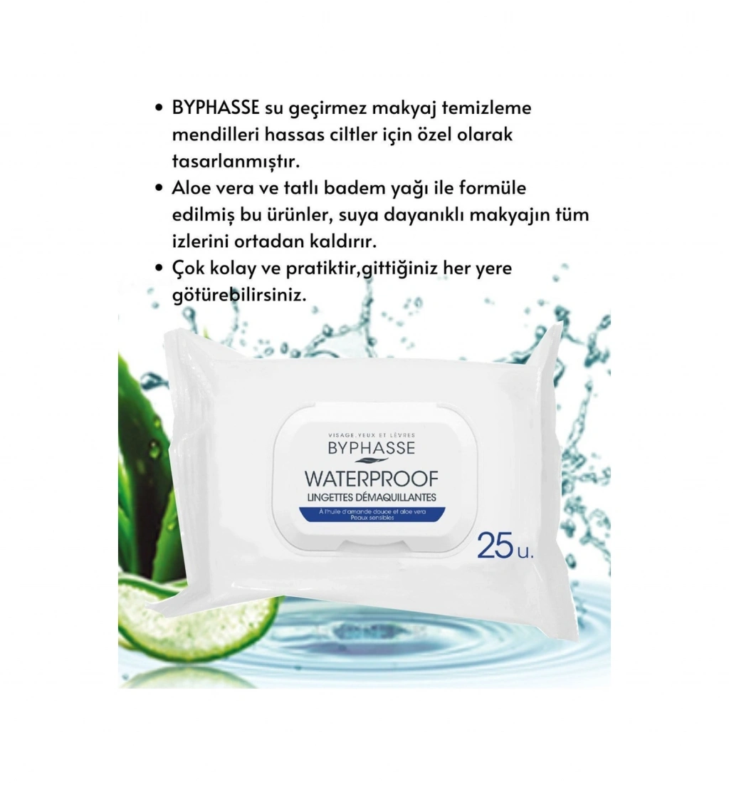 BYPHASSE su geçirmez makyaj temizleme mendilleri hassas ciltler için özel olarak tasarlanmıştır. ;Aloe vera ve tatlı badem yağı ile formüle edilmiş bu ürünler, suya dayanıklı makyajın tüm izlerini ortadan kaldırır. ; ALOE VERA: hassas ciltlere bakım yapar. Kuru ciltler için nemlendirici görevi görür. Tahriş olmuş ciltleri yatıştırır ve rahatlatır.; TATLI BADEM YAĞI : mükemmel bir nemlendirme ve koruma sağlayarak cildinize pürüzsüzlük ve yumuşaklık kazandırır. ;Çok kolay ve pratiktir,gittiğiniz her yere götürebilirsiniz. ;En dayanıklı makyajlar için ideal çözüm ;Kolay açılır , kapanır paket kilidi ;Nasıl Kullanılır :Bu üründen bir adet alarak yüz, göz ve dudaklardaki makyajı cilt dokusuna göre nazikçe silin. Mendilleri nemli tutmak için her kullanımdan sonra paketi dikkatlice kapatın.