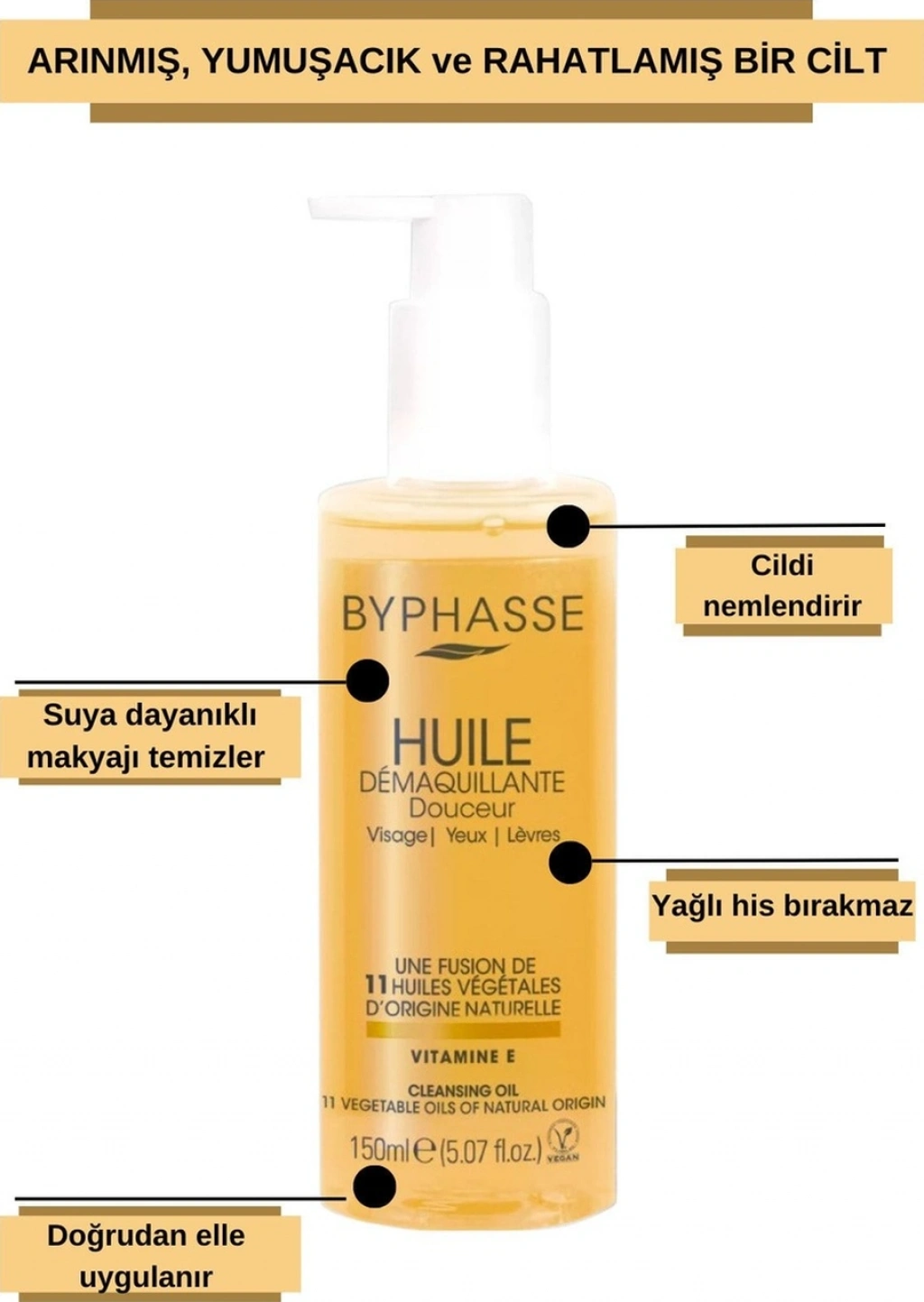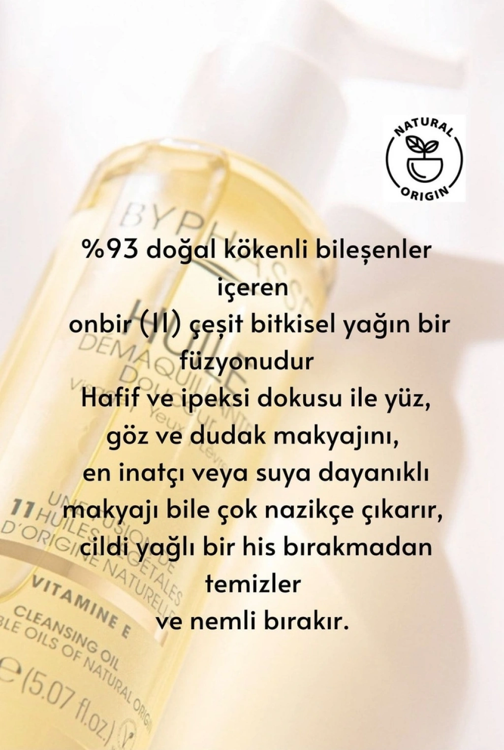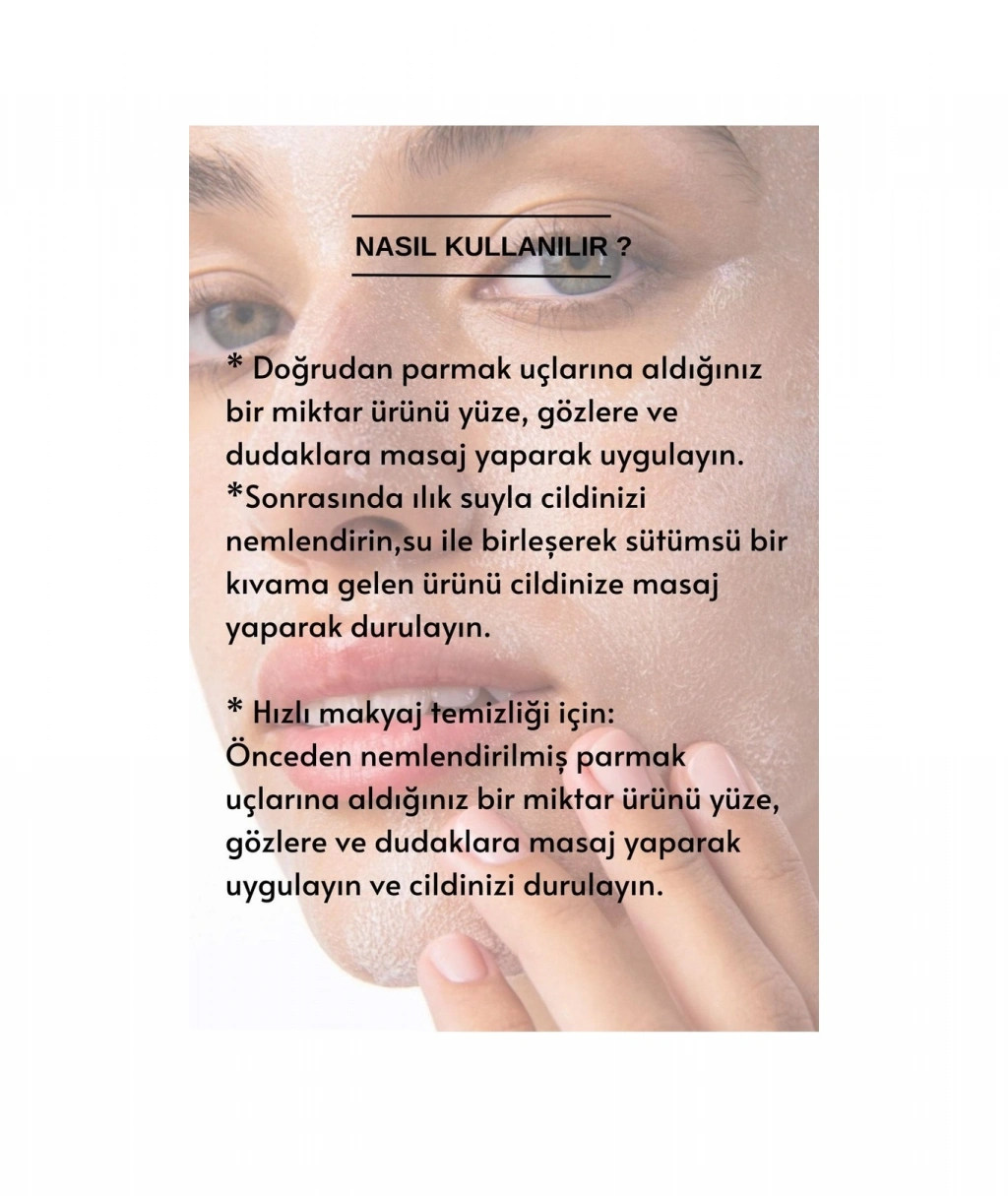 %93 doğal kökenli bileşenler içeren onbir (11) çeşit bitkisel yağın bir füzyonudur ; Hafif ve ipeksi dokusu ile yüz, göz ve dudak makyajını, en inatçı veya suya dayanıklı makyajı bile çok nazikçe çıkarır; Cildi yağlı bir his bırakmadan temizler ve nemli bırakır.; Nasıl Kullanılır : Doğrudan parmak uçlarına aldığınız bir miktar ürünü yüze, gözlere ve dudaklara masaj yaparak uygulayın ;Sonrasında ılık suyla cildinizi nemlendirin,su ile birleşerek sütümsü bir kıvama gelen ürünü cildinize masaj yaparak durulayın. ;Hızlı makyaj temizliği için: Önceden nemlendirilmiş parmak uçlarına aldığınız bir miktar ürünü yüze, gözlere ve dudaklara masaj yaparak uygulayın ve cildinizi durulayın.