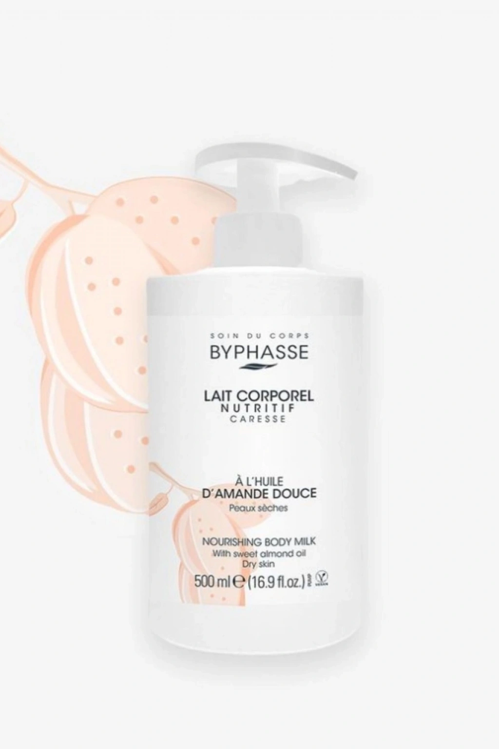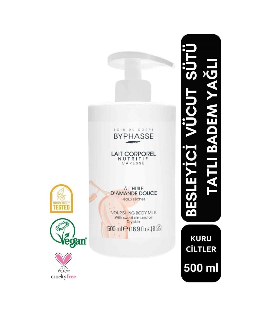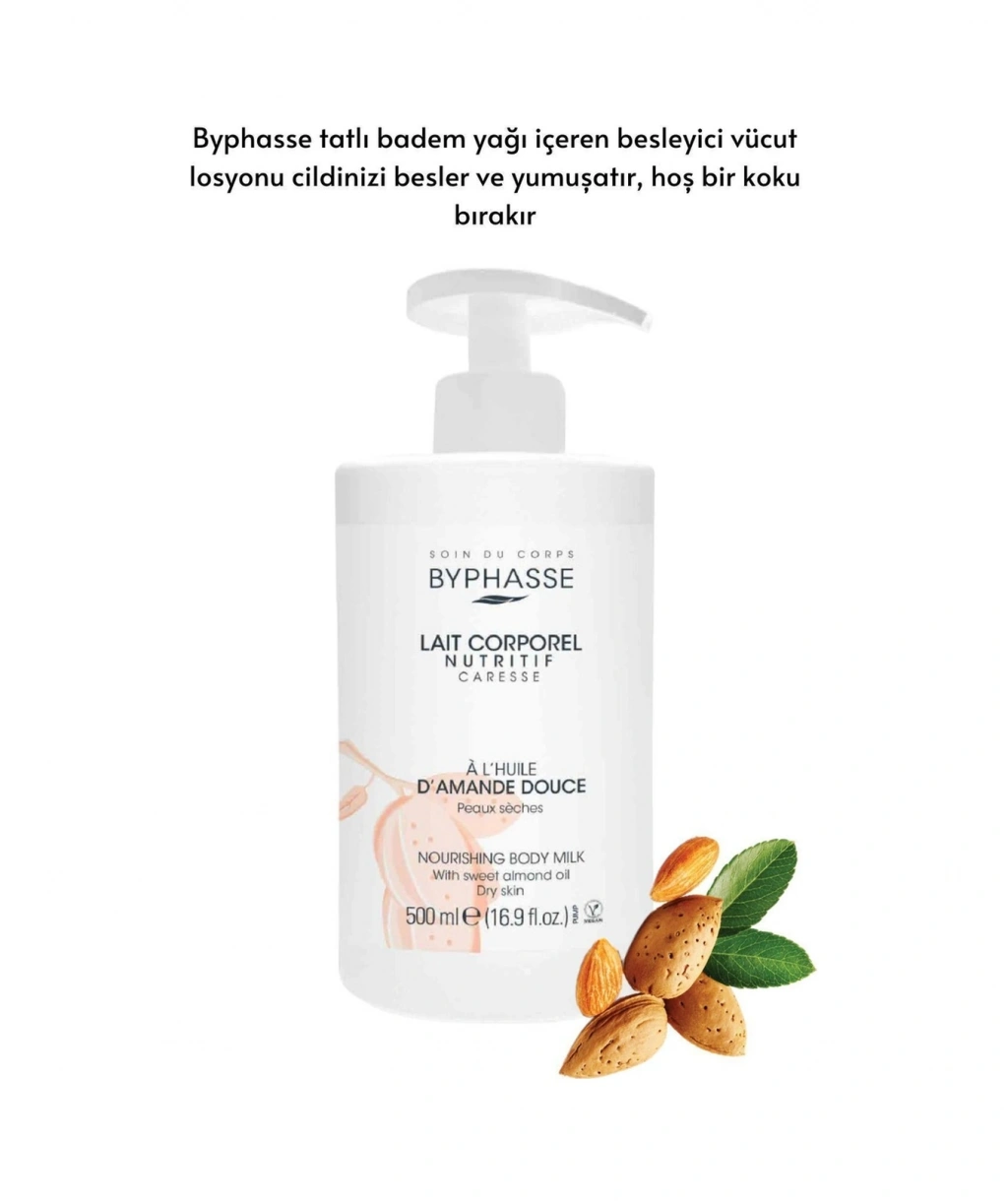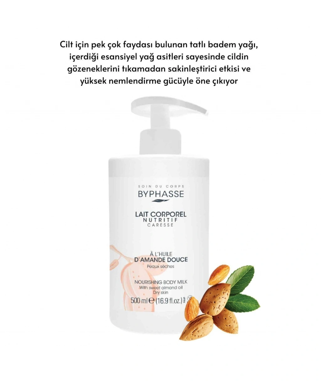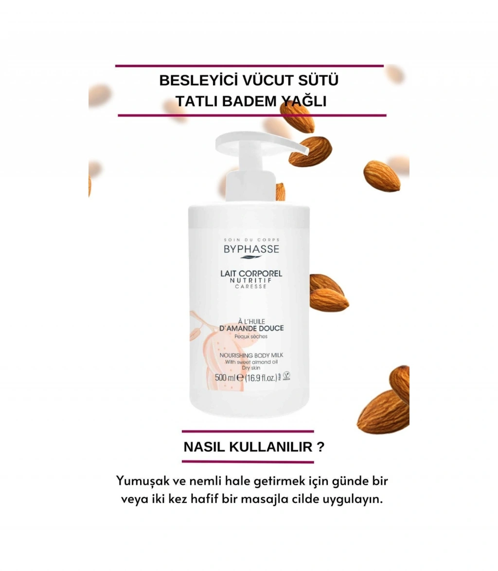 Tatlı Badem Yağı İçerikli Besleyici Vücut Sütü 500ml ;Pratik Pompalı Ambalaj ; Cilt için pek çok faydası bulunan tatlı badem yağı, içerdiği esansiyel yağ asitleri sayesinde cildin gözeneklerini tıkamadan sakinleştirici etkisi ve yüksek nemlendirme gücüyle öne çıkıyor ; %100 Vegan formül; Byphasse tatlı badem yağı içeren besleyici vücut losyonu cildinizi besler ve yumuşatır, hoş bir koku bırakır; Nasıl Kullanılır : Yumuşak ve nemli hale getirmek için günde bir veya iki kez hafif bir masajla cilde uygulayın