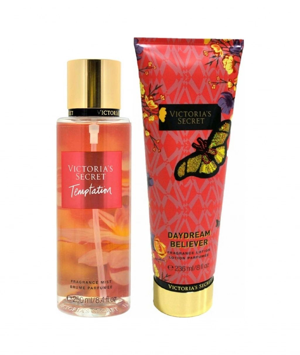Victoria's Secret MIX & MATCH Temptation Vücut Spreyi VE Day Dream Believer Vücut Losyonu 2'li Set ;Sezon boyu gözler üstünüzde. Kalıcı koku için duş sonrası losyonu sürerek cildinizi yumuşatın ve sprey ile son dokunuşu yapın; Temptation : Koku tipi: çiçeksi meyveli , Koku notaları: Sulu elma ve saguaro çiçeği kombinasyonuyla, yumuşatıcı aloe vera ve sakinleştirici papatya notalarını içerir ; Day Dream Believer: Koku tipi: odunsu, çiçeksi , Koku notaları: Kadife şakayık. Biber ağacı. Kelebek öpücükleri